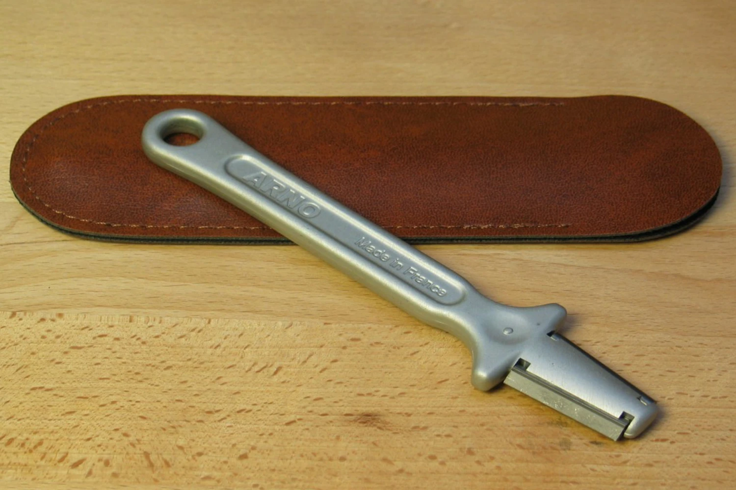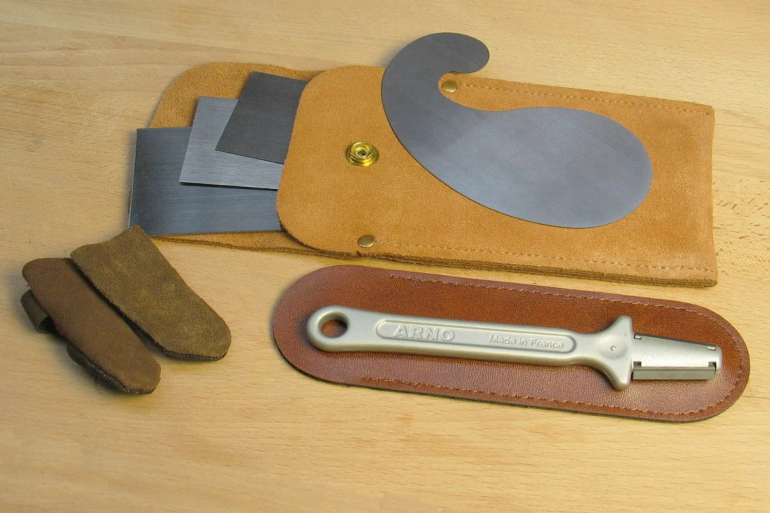 The ARNO Ébéniste Scraper Set contains: 1.0mm rectangular scraper for heavier work, removing glue and old finishes 0.6mm rectangular scraper for medium/general work 0.4mm rectangular scraper for finishing boards and chasing small patches of tearout in a planed surface 0.6mm gooseneck scraper for finishing concave surfaces Handmade French suede scraper wallet with internal PVC dividers to protect the formed hooks of scrapers from damage Carbur2 carbide burnisher polished tungsten carbide inserts produce a beautifully smooth cutting burr, the triangular side of the burnisher has a very tight radius at the centre which focuses the pressure so you need less of it less pressure = more control Pair of suede thumb guards to protect your thumbs from the heat that develops in the blade whilst scraping Regular price if products purchased separately: £98.60Carbur2 leather wallet may varyClick here for Matthew’s video showing how to use the Carbur 2 to sharpen a cabinet scraper