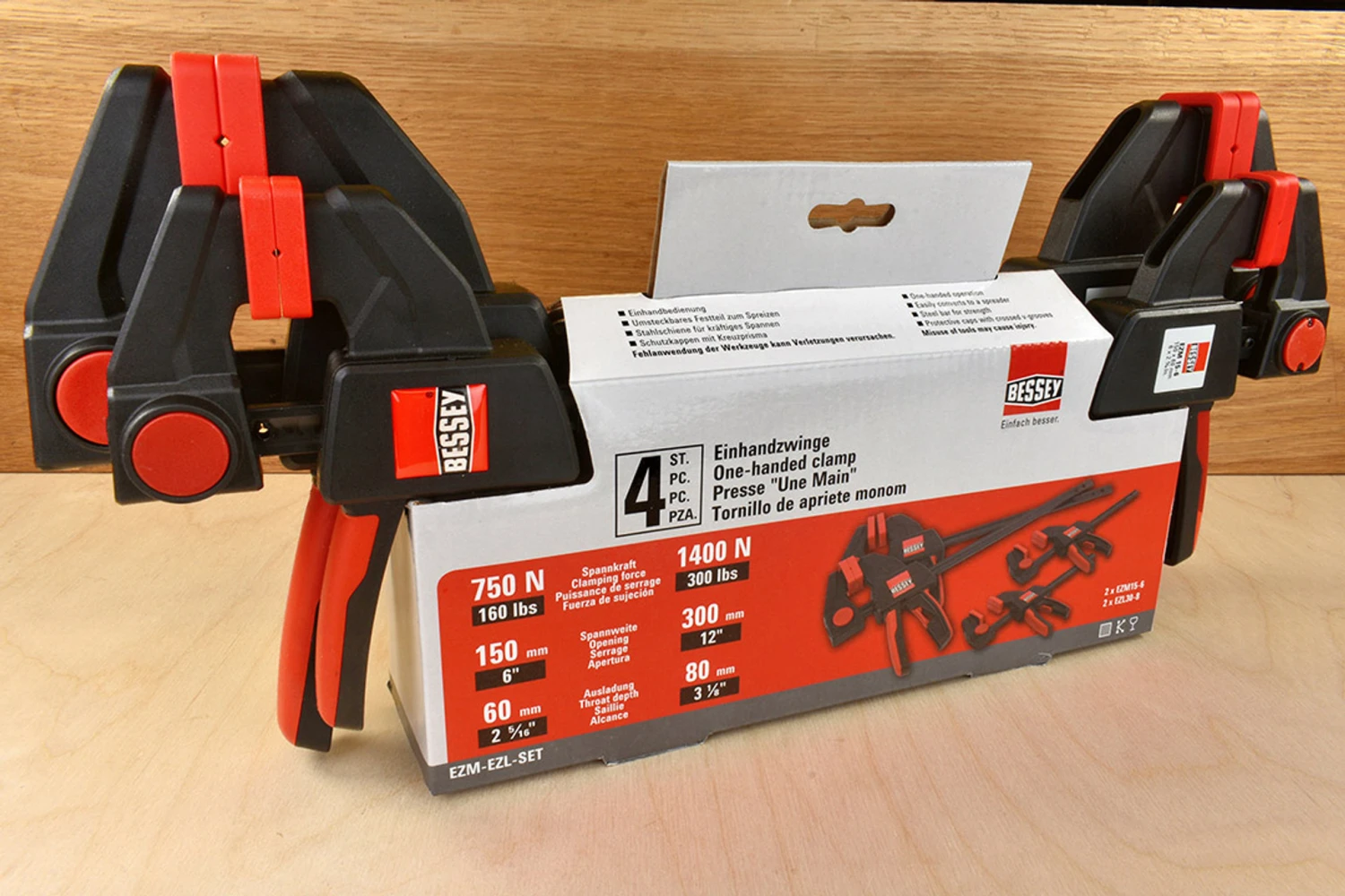 Set of 4 Bessey one-handed clamps that can be used to both clamp and spread work. The steel bar has strength and the comfortable plastic handles have a pump lever and quick release mechanism so the clamp and sliding brackets can be adjusted with ease. An added bonus is that switching between clamping and spreading requires no additional tools and your work will also be protected by the crossed grooved caps.EZM15-6 x2 Opening: 150mm Throat depth: 60mm Clamping force: 750N (160lbs) EZL30-8 x2 Opening: 300mm Throat depth: 80mm Clamping force: 1400N (300lbs)