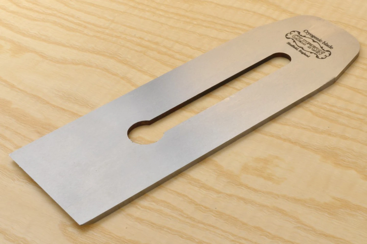The new Clifton cryogenically treated plane irons are laser cut from hot rolled O1 carbon steel plate. The red hot steel is passed through a series of rollers that progressively forge the steel whilst gradually reducing its thickness. If you have ever seen railway line or armour plate being roll forged, the process is very similar. After cutting, the blades are normalised to refine the steel’s microstructure and then reheated and quenched in liquid nitrogen.The effect of Cryo treatment on plain carbon steels is not as pronounced as it is on air hardening steels like A2 or D2, but the result is a hard, strong, stable blade that retains the characteristic stone feel and fine edge taking qualities of Sheffield carbon steel.From a user perspective, one of the main benefits of the new process is that the bevel side can be determined after heat treatment (with a hot struck blade the face side is determined at the forging stage). This means that the flat side of the blade is now always substantially flat with a slight tolerance for beneficial concavity.In short, the mouth-watering sharpness and pleasant honing characteristics of the original hand forged Clifton irons are retained, but they are easier to prepare, a smidgen harder and have fractionally better wear resistance.If you are retrofitting a Clifton iron to an old Stanley or Record plane, please check that you have at least 4mm of Y lever tab protruding above the surface of the frog. Fits: No.4½, No.5½, No.6 and No.7 bench planes Width: 2⅜” Thickness: 3mm Made in Sheffield