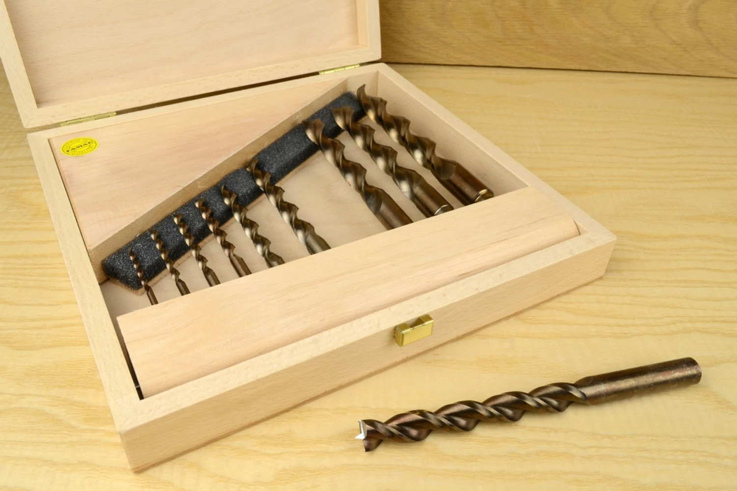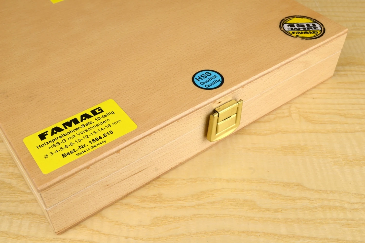 Fully ground HSS is fairly common in premium quality metalworking drills, although most manufacturers deem it unnecessary over specification in woodwork tooling. FAMAG disagree, they believe that using over specified materials and manufacturing methods results in a tool that will deliver superior performance, durability and results. It took me one hole with the FAMAG 1594 series drill to work out who was right.Usually the spiral channel that extracts the chips is a symmetrical U shape in cross section. FAMAG round over the trailing edge which increases the amount of space for waste removal by nearly 50%. The pitch is also more aggressive which also helps to keep the cutting face clear.You don’t get compressed wooden spirals stuck in the flutes with these bits, instead they eject a plume of chips as they are cutting, which means you can go to full depth as fast as you like and they still cut cleaner, cooler, faster and longer than anything else on the market.Set of 10 pieces in a wooden case. 3, 4, 5, 6, 8, 10, 12, 13, 14 and 16mm