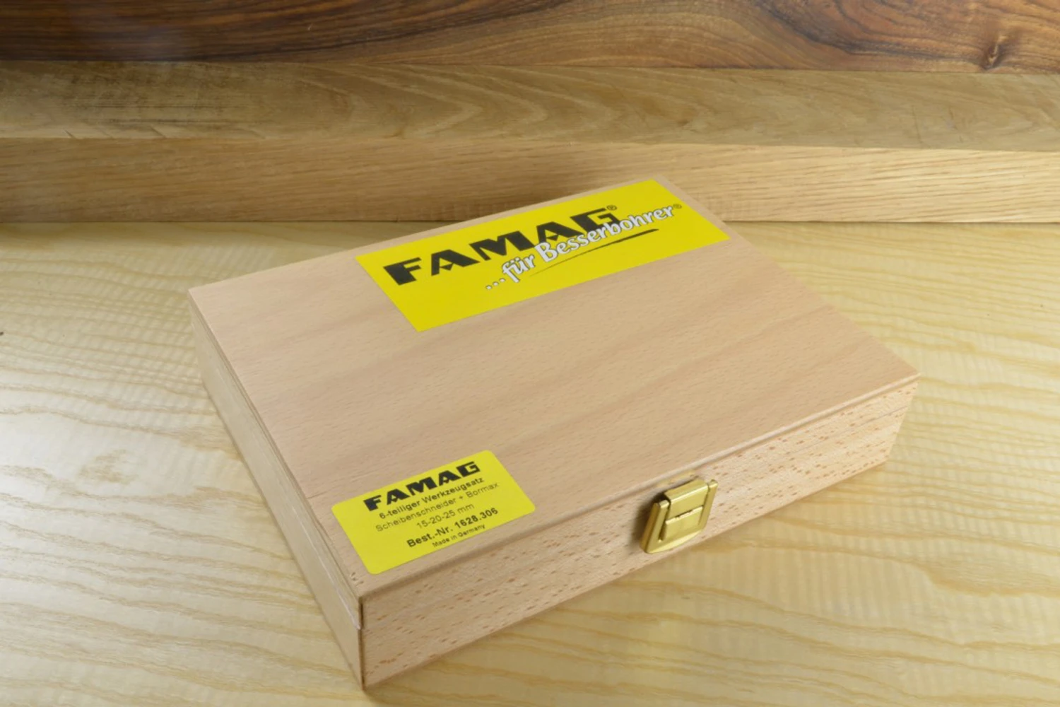 When both hole and plug are cut with FAMAG tooling made to 1/100th of a millimetre accuracy the result is a perfectly (almost invisibly if you match the grain up) plugged hole.For best results use the FAMAG 1616 plug cutter to cut the plugs as close as possible to an edge of the timber with the outside of the cutter protruding from the blank, this allows the swarf to clear with each rotation.Set of 6 pieces in a wooden case containing the following: FAMAG 1616 Plug Cutter 15mm FAMAG 1616 Plug Cutter 20mm FAMAG 1616 Plug Cutter 25mm FAMAG 1622 Bormax Bit 15mm FAMAG 1622 Bormax Bit 20mm FAMAG 1622 Bormax Bit 25mm