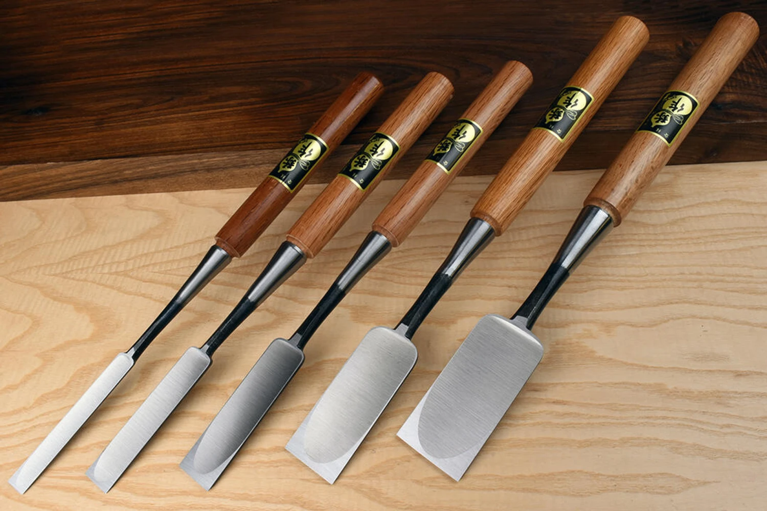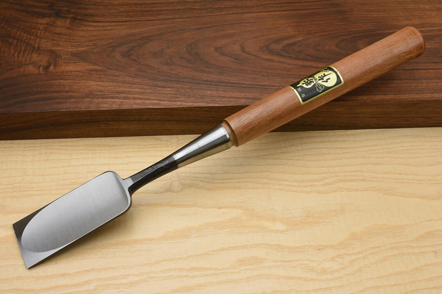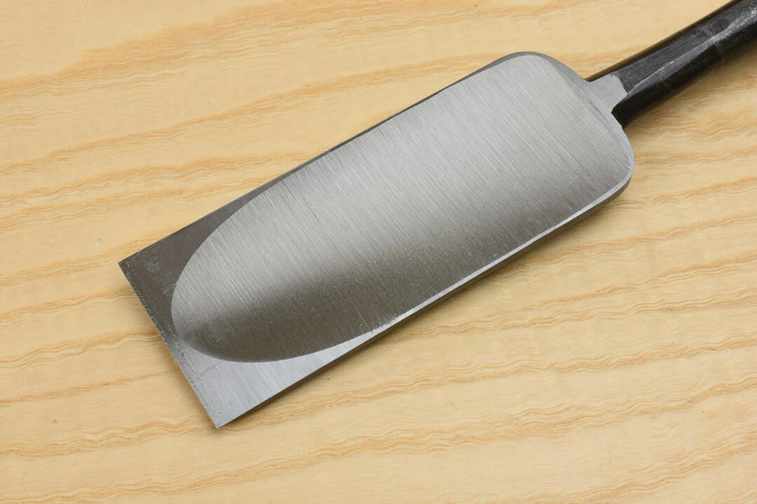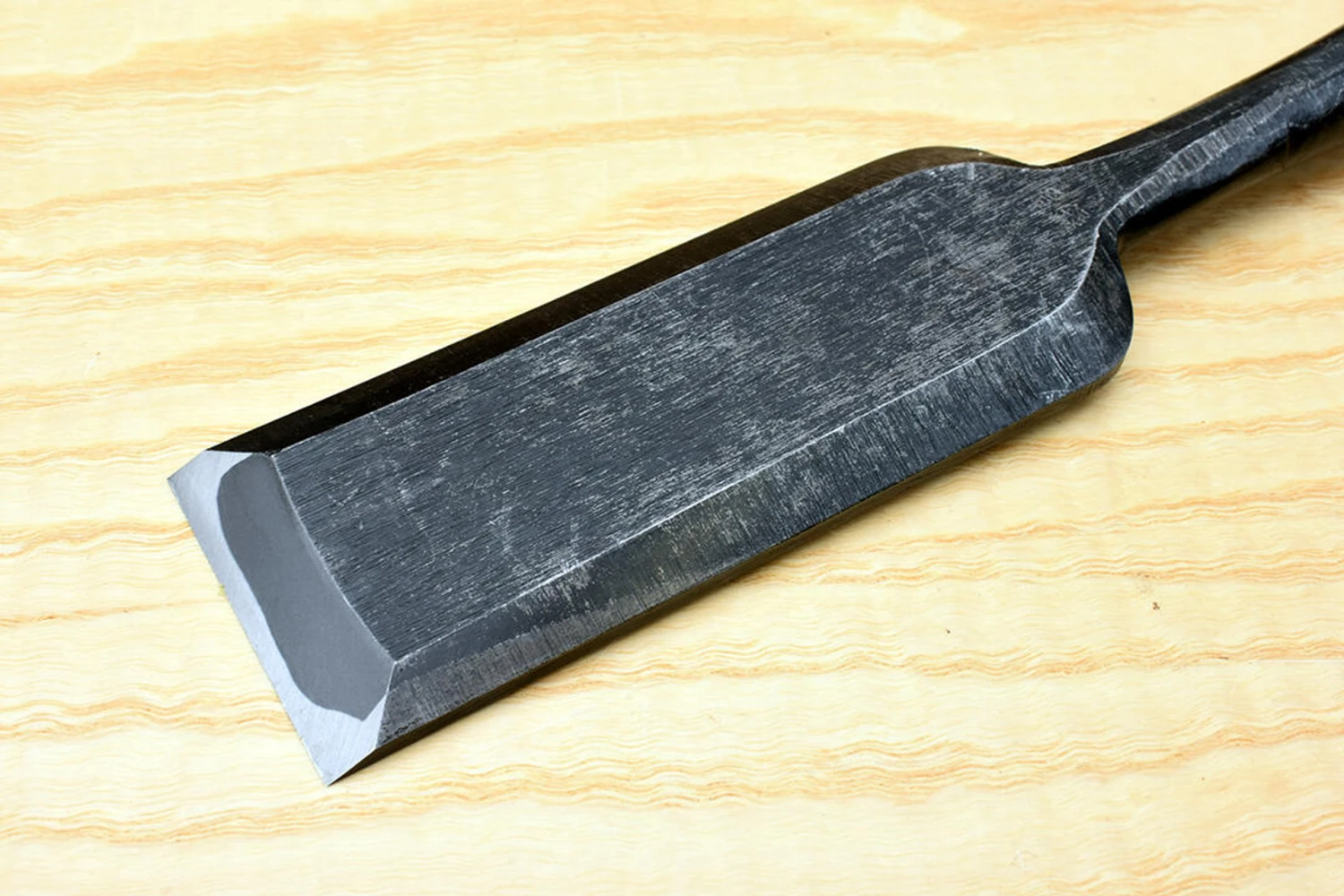 These beautifully hand forged and ground laminated Japanese paring chisels from Fujikawa San are a delight to use. Available as either Kinari Nomi (straight bladed Japanese paring chisels) or Kote Nomi (cranked Japanese paring chisels). Japanese paring chisels are light elegant tools designed for creating precision surfaces by hand, they are only pushed, never struck, and certainly never used to lever or pry. The blades are formed from hard white paper steel No.1 wrapped around a softer iron jigane body that provides strength. This type of construction means that with careful heat treatment the cutting edge can be made much harder, giving an exquisitely crisp edge that holds for ages, especially in hard or abrasive timbers.Mr Fujikawa insists on absolutely traditional methods. His Smiths work in a darkened blacksmithing shop so that they can see the colour of the steel they are working, and use coke to minimise carbon loss as the steel is heated. Quenching is done in water as this provides the fast quench needed for highly pure steels, the soft water in Miki city is particularly well suited to the job. The blades are cooled in straw ash to retain as much carbon as possible whilst the steel structure changes after the quench.