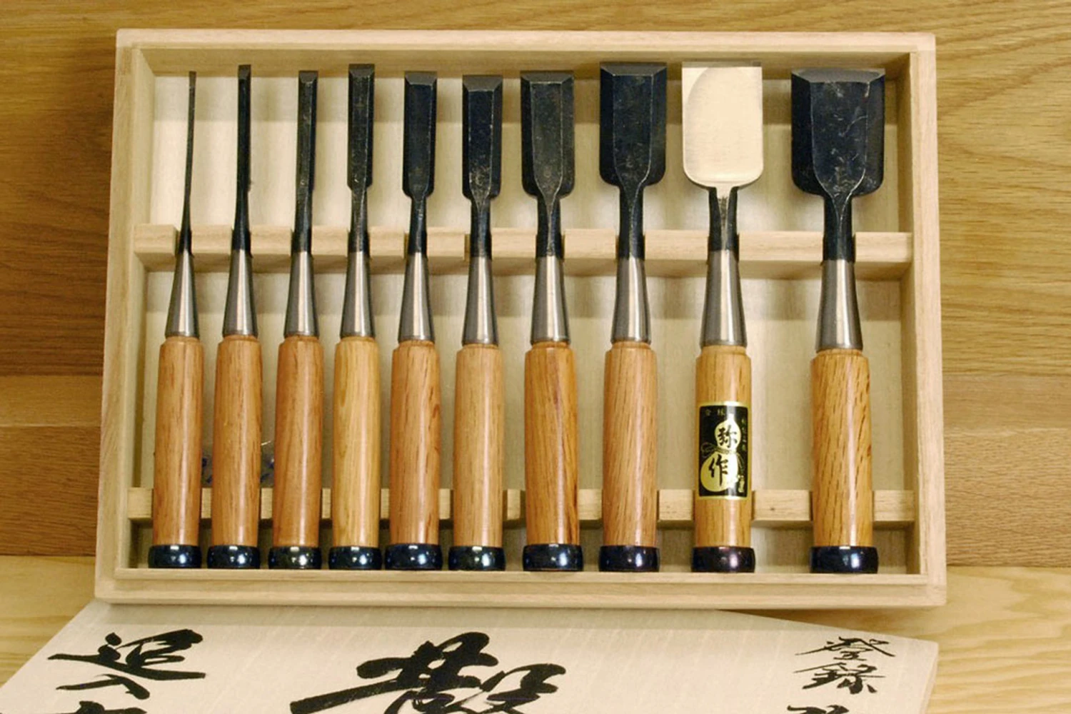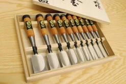 Fujikawa use a specially selected grade of Hitachi White Paper Steel No1 to make the hagane layer that forms the back and the cutting edge. There are three main grades of white steel, No1 having the highest carbon content, and a myriad of sub grades within each. It took 10 years of experimentation to find the perfect grade, but they can now produce blades which have similar hardness and edge retention to blue, but retain the higher fracture resistance of white.Mr Fujikawa insists on absolutely traditional methods. His smiths work in a darkened blacksmithing shop so that they can see the colour of the steel they are working, and use coke forges to minimise carbon loss as the steel is heated. Quenching is done in water as this provides the fast quench needed for highly pure steels. The soft water in Miki city is particularly well suited to the job. The blades are cooled in straw ash to retain as much carbon as possible as the steel structure changes after the quench.After hand grinding, the blades are fitted with premium grade red oak handles and deeply hot blued hoops.The manufacturers recommend honing a single flat bevel, following the optimal 34 degree angle that the tools are ground to when supplied.The full set is presented in a fitted box made from lightweight kiri (paulownia) wood. Kiri is a lightweight, very stable, sustainable timber with excellent natural humidity regulating and anti-corrosive properties. Material: Selected White Paper Steel No.1 C 1.4%, Si 0.1%, Mn 0.2%, Ph 0.025% or less, S 0.004% or less Hardness: RC68 Overall Length: 225mm Handle Material: Hon Akagashi (premium Japanese Red Oak) Click here to read our blog on how to prepare a Japanese chisel