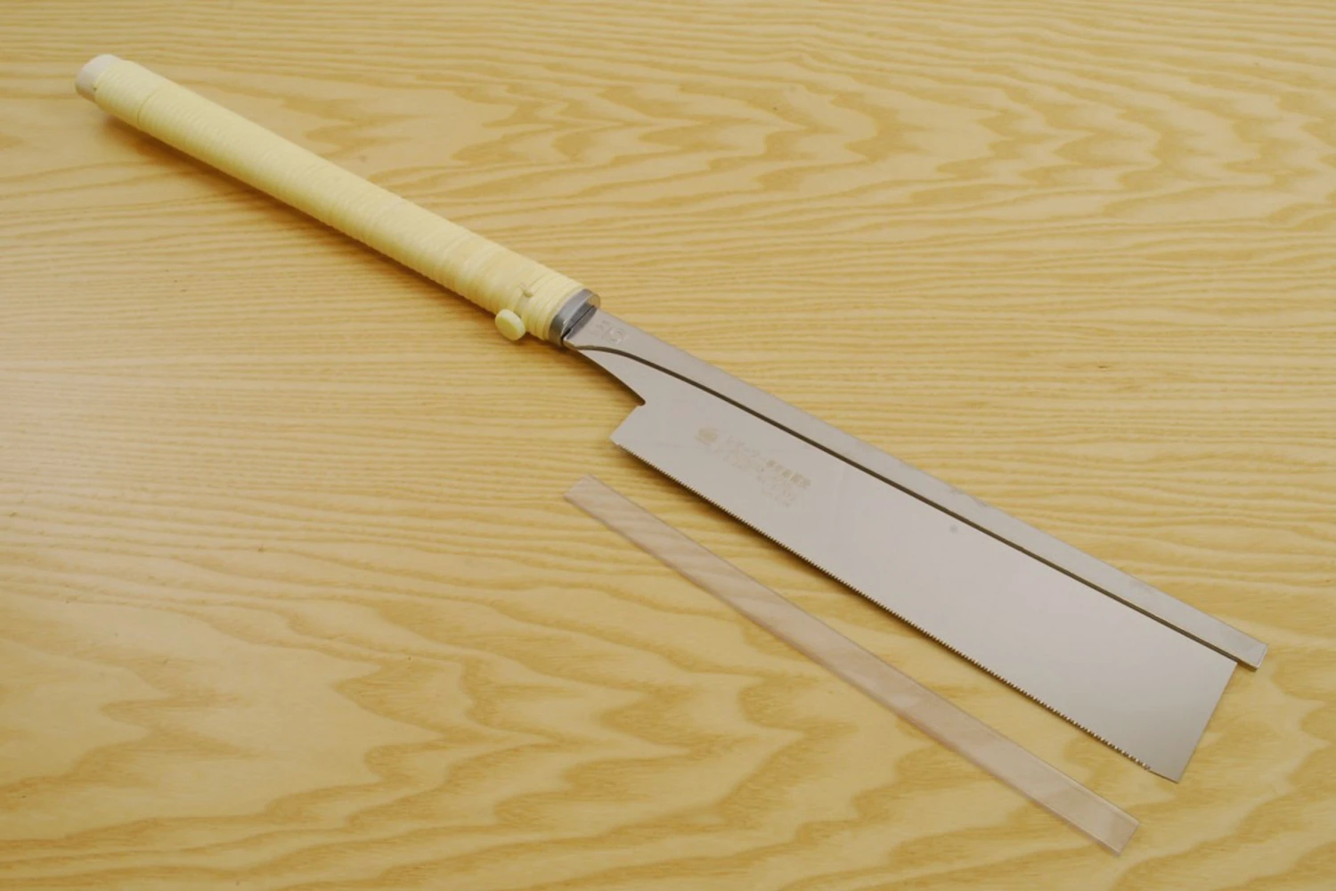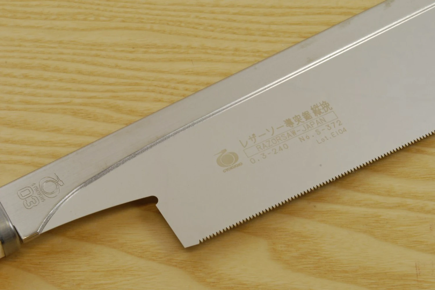 The Gyokucho 372 dozuki is gaining quite a reputation as ‘the one to have’ for fine joinery.The pitch is 1.3mm, the same as the Sun Child, but the 372 has a longer back, and the blade is a little bit deeper at 55mm making it an ideal choice for small tenon cheeks, and for use with a guide block or small magnetic guide for dovetailing. The thin (0.3mm) blade removes very little material and leaves a clean surface for maximum joint strength.The blades of Gyokucho saws are treated using a process called electroless nickel plating, this has three functions. Firstly, it protects the blade against corrosion, secondly it provides a nice shiny mirror surface, and thirdly its low friction properties inhibit resins and sap from building up on the blade – anything that does manage to get stuck to them can easily be washed off with warm soapy water. The teeth are differentially impulse hardened, one by one, bringing the outer surfaces to RC68 or more whilst still leaving the root of the tooth soft and therefore much less prone to fracture – not unlike tiny Japanese sword blades. They are equally happy working in softwoods or temperate hard woods and can, with care and a light touch, be used on exotic timbers too. Blade length: 240mm Overall length: 600mm Blade thickness: 0.3mm Pitch: 1.3mm / 19.5tpi Set: 0.1mm per side Max practical depth of cut 50mm Traditional rattan wrapped paulownia wood handle Replacement blade = Part No S372 (S371 crosscut blades will also fit this saw) The TPE handle version can be found here – Gyokucho 375 TPE Professional Tatebiki Rip Dozuki 240mm