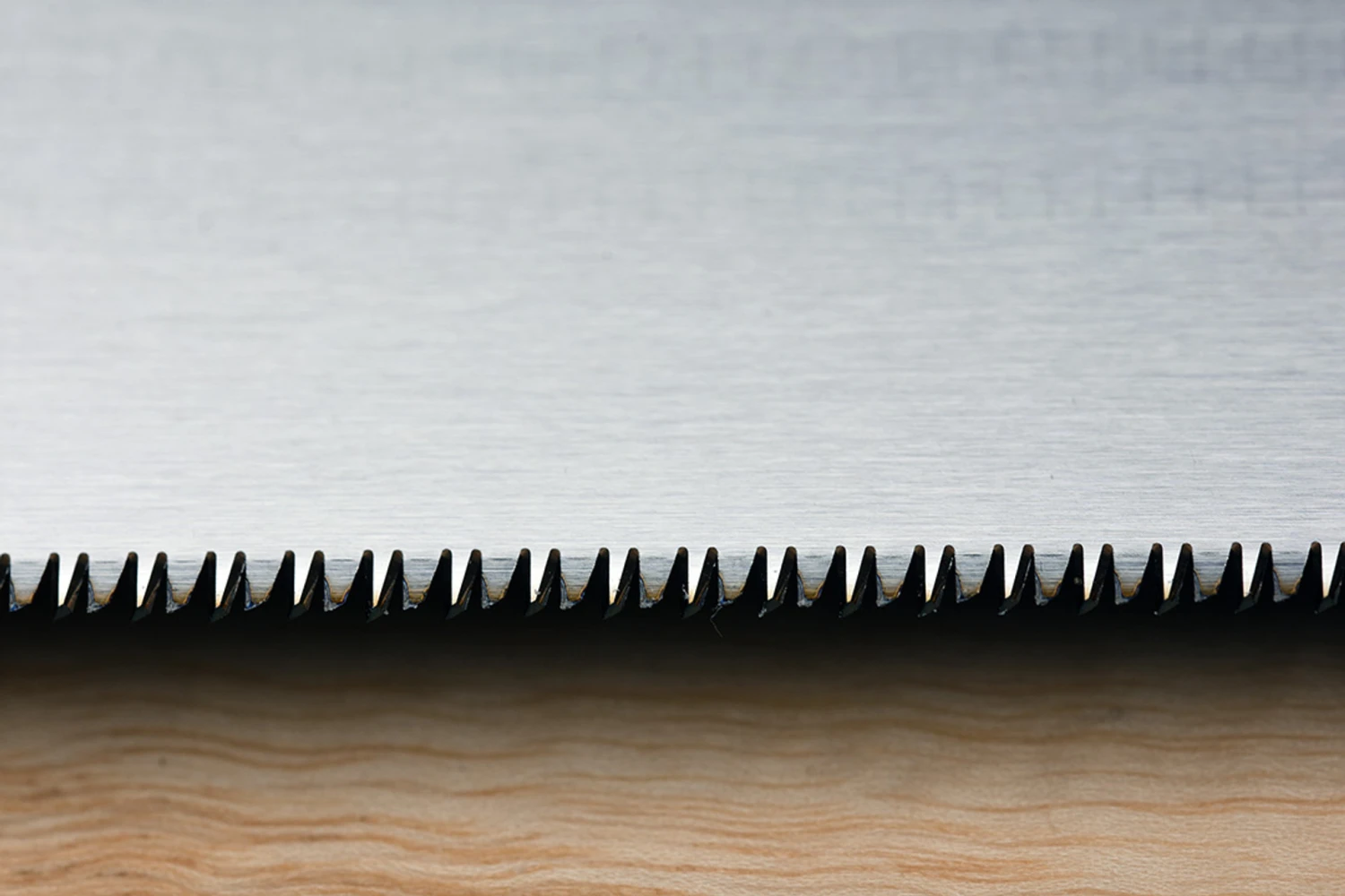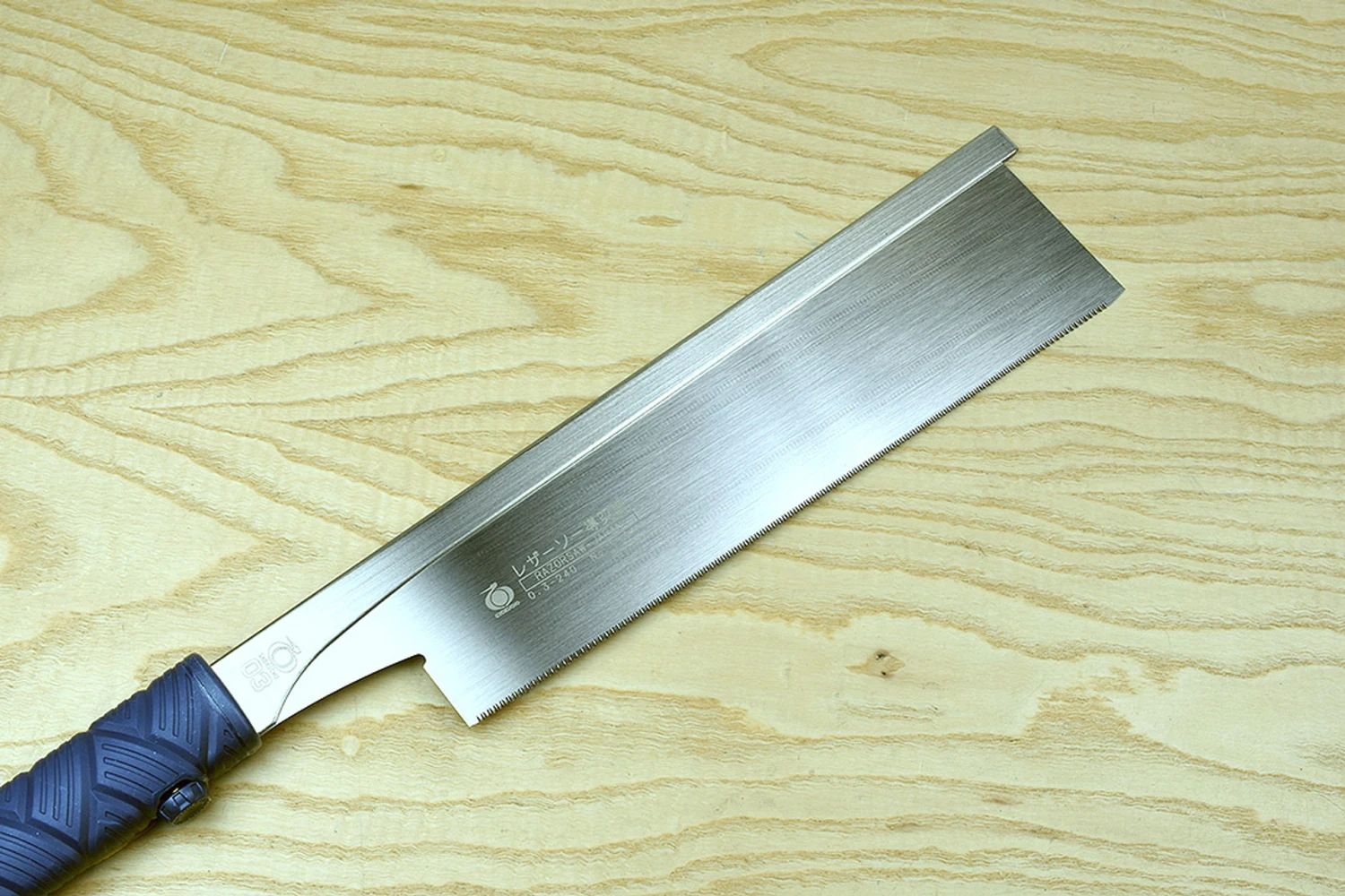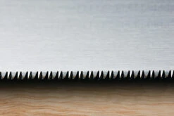 Gyokucho razorsaws, the original replaceable blade Japanese saws, have long been renowned for their cutting efficiency and excellent durability. The latest generation of Gyokucho saws have blue handles made from TPE (thermoplastic elastomer) a remarkable material that is simultaneously hard and resilient yet feels velvety to the touch and affords a superb grip. Rest assured that TPE is an eco-friendly alternative to rubber, and isn’t harmful to the environment as it is completely recyclable.The Gyokucho 373 is a professional crosscut dozuki, an accurate saw with a very thin plate and a full length spine used for similar tasks to a western carcase saw; trimming components to final length, defining the shoulders of half laps and housings etc.The blades of Gyokucho saws are treated using a process called electroless nickel plating, this has three functions. Firstly, it protects the blade against corrosion, secondly it provides a nice shiny mirror surface so you can gauge your cutting angles, and thirdly its low friction properties inhibit resins and sap from building up on the blade – anything that does manage to get stuck to them can easily be washed off with warm soapy water. The teeth are differentially impulse hardened, one by one, bringing the outer surfaces to RC68 or more whilst still leaving the ‘root’ of the tooth soft and therefore much less prone to fracture – not unlike tiny Japanese sword blades. They are equally happy working in softwoods or temperate hard woods and can, with care and a light touch, be used on exotic timbers too. Blade length 240mm Overall length 550mm Blade thickness 0.3mm Pitch 1mm / 25.4tpi Set 0.125mm per side Max depth of cut = 45mm TPE handle Replacement blade = Part No S-370 (371 and 372 will also fit this saw)