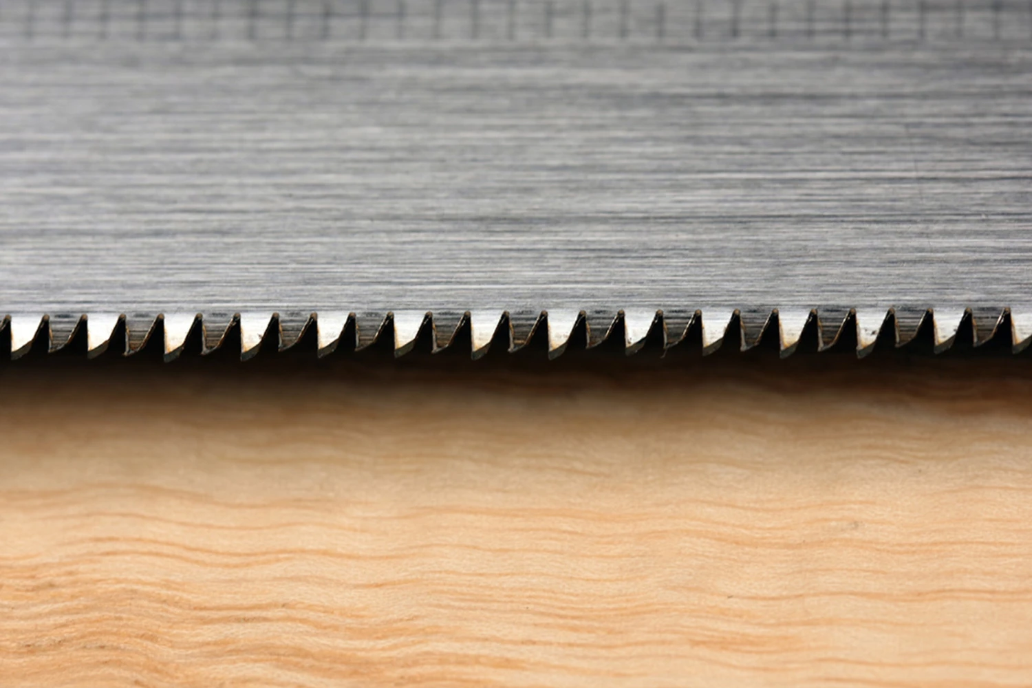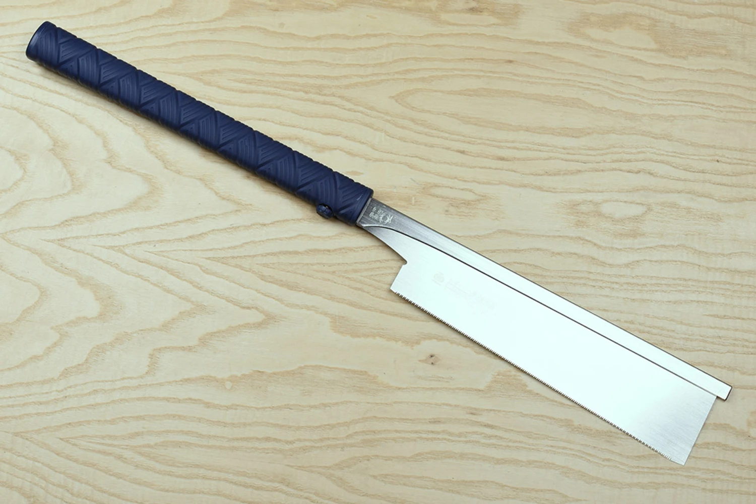 Gyokucho razorsaws, the original replaceable blade Japanese saws, have long been renowned for their cutting efficiency and excellent durability. The latest generation of Gyokucho saws have blue handles made from TPE (thermoplastic elastomer) a remarkable material that is simultaneously hard and resilient yet feels velvety to the touch and affords a superb grip. Rest assured that TPE is an eco-friendly alternative to rubber, and isn’t harmful to the environment as it is completely recyclable.The Gyokucho 375 is a professional dozuki with rip teeth, an accurate saw with a very thin plate and a full length spine it is the equivalent of a western dovetail saw, also capable of performing the cheek cuts of small tenons, bridle joints etc in furniture making. At very fine pitches you can get away with using a rip tooth for occasional crosscutting, albeit not quite as efficient or clean as a crosscut saw.The blades of Gyokucho saws are treated using a process called electroless nickel plating, this has three functions. Firstly, it protects the blade against corrosion, secondly it provides a nice shiny mirror surface so you can gauge your cutting angles, and thirdly its low friction properties inhibit resins and sap from building up on the blade – anything that does manage to get stuck to them can easily be washed off with warm soapy water. The teeth are differentially impulse hardened, one by one, bringing the outer surfaces to RC68 or more whilst still leaving the ‘root’ of the tooth soft and therefore much less prone to fracture – not unlike tiny Japanese sword blades. They are equally happy working in softwoods, man made boards, or temperate hard woods and can, with care and a light touch, be used on exotic timbers too. Blade length 240mm Overall length 550mm Blade thickness 0.3mm Pitch 1.3mm / 19.5tpi Set 0.125mm per side Max depth of cut = 45mm TPE handle Replacement blade = Part No S-372 (S-370 and S-371 will also fit this handle and spine) The traditional rattan handle version can be found here – Gyokucho 372 Professional Rip Dozuki 240mm