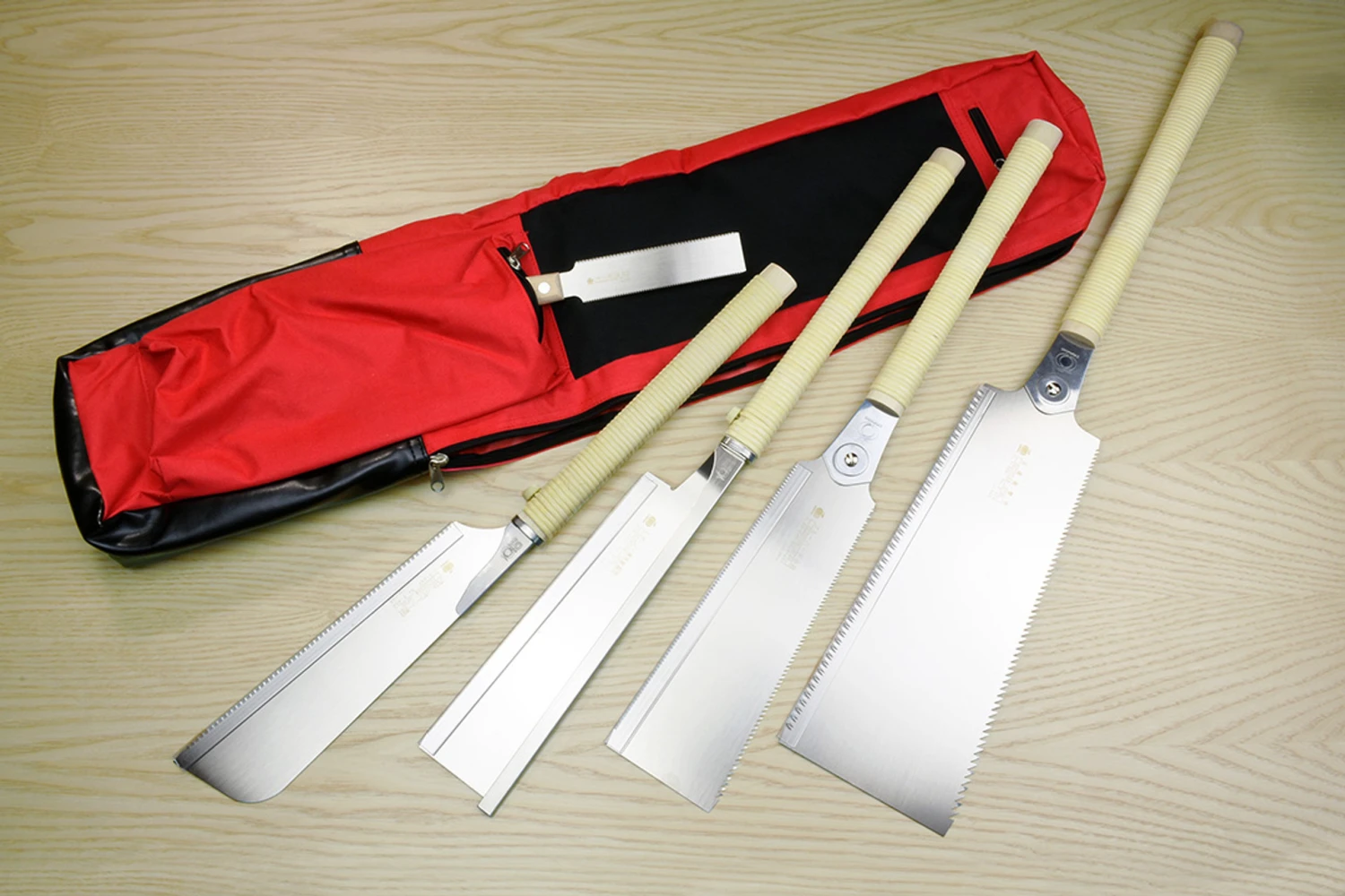 Gyokucho are the world’s favourite Japanese saws and as soon as you use one it’s easy to understand why. This comprehensive set of five Gyokucho saws covers all of the sawing tasks you are likely to encounter when making furniture.First up is the impressive 616 ryoba, a hugely capable rip and crosscut saw that will happily resaw 4 to 5 inch wide boards into thinner, bookmatched, 4 to 5 inch boards and crosscut them to length. It will also handle workbench sized joinery with speed and accuracy.The 400 Ibrame kataba is a panel saw, it will happily rip an 8 foot by 4 foot sheet of ply in half lengthwise in under a minute, without straying from your pencil line. Like all Gyokucho saws it has a mirror polished electroless nickel plated blade that resists corrosion and shrugs off resins.The 651 Ryoba is designed for cabinetmaking with a harder, stiffer blade and a shallower angle between the edges. This is your tenon saw, with rip teeth on one side and crosscut on the other, most of your component prep will be done with this.For dovetailing we have included the popular 372 dozuki, a full spine professional dovetail saw with a plate thickness of just under â…“ of a mm and beautifully fine razor sharp teeth.The finishing touch is the 1151 double edged flush cutting saw, with a highly flexible blade and unset teeth for trimming through tenons, wedges, drawbore pegs and dowels flush with the surrounding surface.The set comes in a purpose designed nylon saw case with internal leaves to protect the saws from each other, external pockets, a shoulder strap and a loop so that it can hang on a nail in the workshop.Regular price if items purchased individually: £229.90