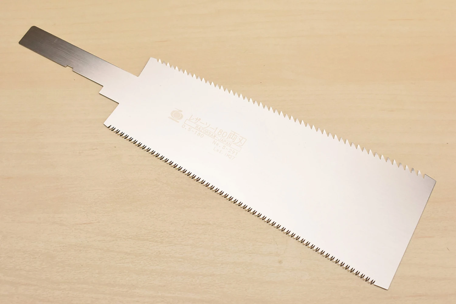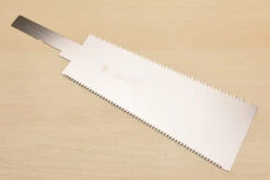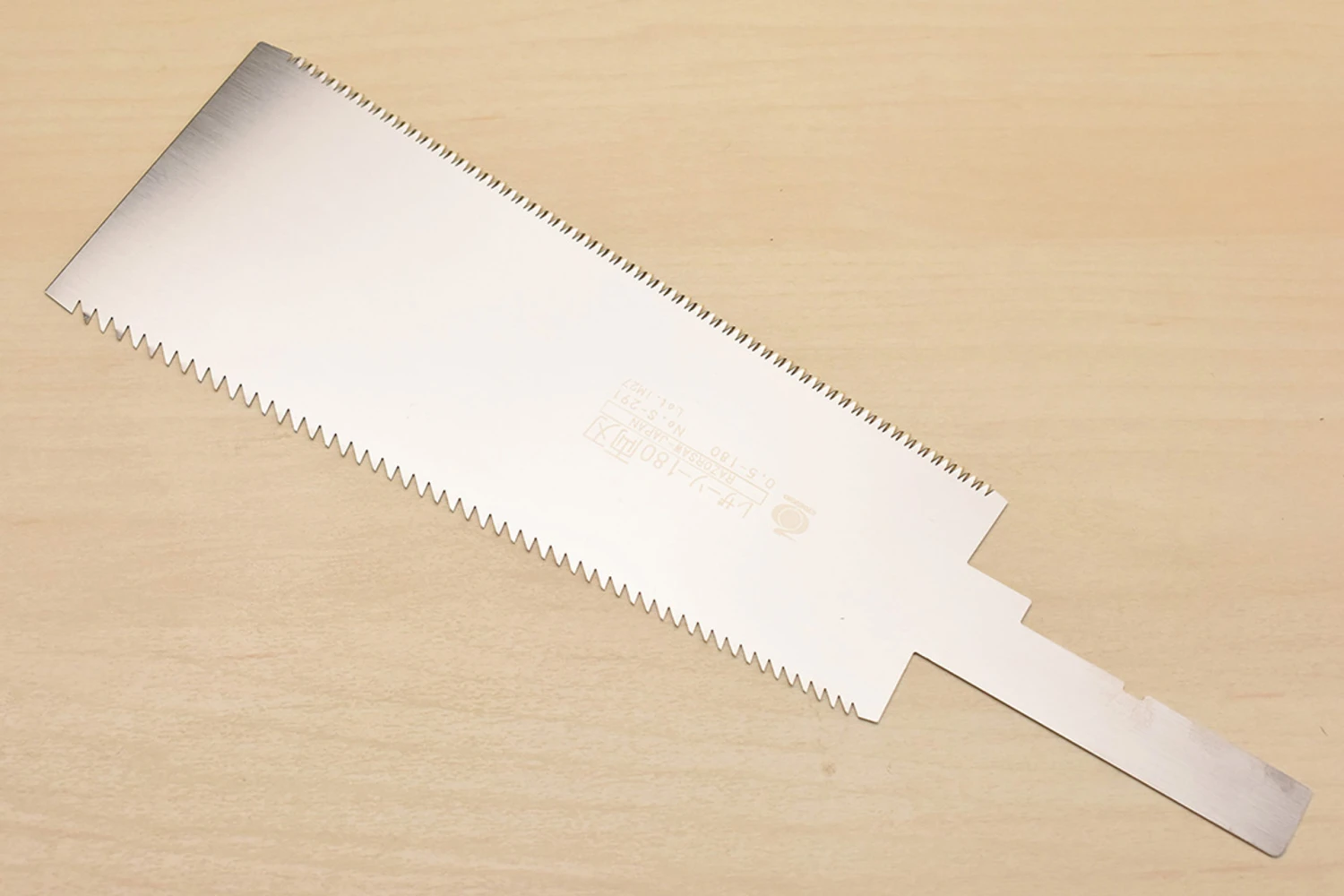 When fitting a replacement blade on a Gyokucho Compact saw, we recommend installing the tooth protection strip supplied with the saw or using the cardboard sleeve supplied with the spare blade as this makes the blade easier to handle.Turn the wheel on the handle away from the blade to slacken off the hold; the blade will slide out of the spine. Slot the replacement blade into place and reverse the process. Blade length: 180mm Overall length: 390mm Blade thickness: 0.5mm Blade depth: 55mm to 75mm Crosscut pitch: 1.5mm / 17tpi Progressive rip pitch: 3mm to 4mm / 9 to 8 tpi Set: 0.125mm per side