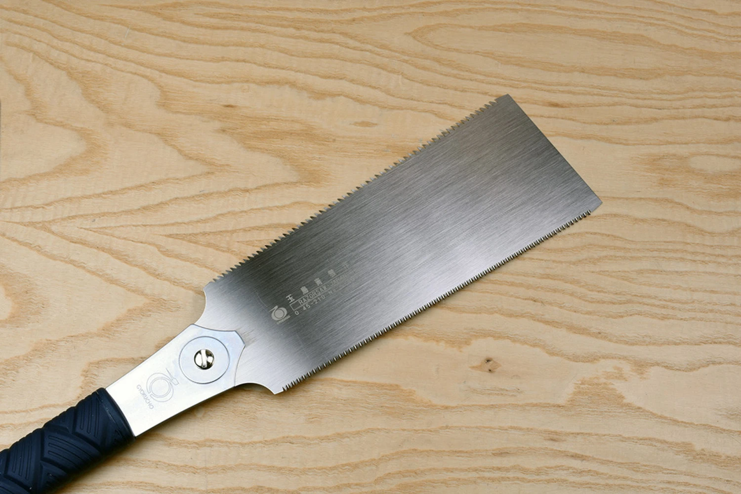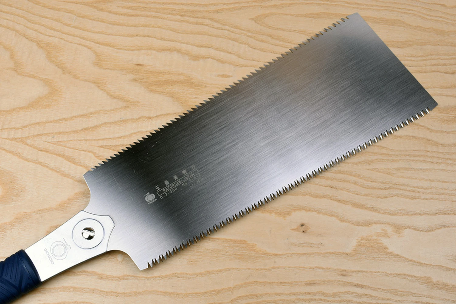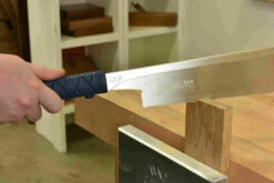 Seiun Saku are the standard ryoba for carpentry and joinery work, the angle between the centreline and the toothline is carefully calculated to give a rapid yet smooth cut and the heat treatment is optimised for springiness, i.e. the degree to which the blade can be distorted and still return to its original shape.Blade Length210mm240mm240mmfine tooth270mm300mmModel No.660661662663664Blade Depth70 – 87mm77 – 97mm77 – 97mm90 – 115mm95 – 120mmOverall Length530mm560mm560mm645mm680mmBlade Thickness0.45mm0.5mm0.45mm0.6mm0.7mmPitch XC1.5mm16.9tpi1.7mm 14.9tpi1.3mm 19.5tpi2.5mm 10.2tpi3mm 8.7tpiPitch Rip3.7-2.5mm6.9-10.2tpi3.8-2.4mm6.7-10.6tpi3.8-2.4mm6.7-10.6tpi5.6-3.8mm4.5-6.7tpi5.6-3.5mm4.5-7.3tpiSet per Side0.125mmm0.125mm0.125mm0.125mm0.125mmMax Depth∞∞∞∞∞Replacement BladeS605S610S611S615S616Accepts BladesS610S611S649S650S651S605S611S649S650S651S605S610S649S650S651S616S655S615S655 Gyokucho razorsaws, the original replaceable blade Japanese saws, have long been renowned for their cutting efficiency and excellent durability. The latest generation of Gyokucho saws have blue handles made from TPE (thermoplastic elastomer) a remarkable material that is simultaneously hard and resilient yet feels velvety to the touch and affords a superb grip. Rest assured that TPE is an eco-friendly alternative to rubber, and isn’t harmful to the environment as it is completely recyclable.The blades of Gyokucho saws are treated using a process called electroless nickel plating, this has three functions. Firstly, it protects the blade against corrosion, secondly it provides a nice shiny mirror surface so you can gauge your cutting angles, and thirdly its low friction properties inhibit resins and sap from building up on the blade – anything that does manage to get stuck to them can easily be washed off with warm soapy water.The teeth are differentially impulse hardened, one by one, bringing the outer surfaces to RC68 or more whilst still leaving the ‘root’ of the tooth soft and therefore much less prone to fracture – not unlike tiny Japanese sword blades. They are equally happy working in softwoods or temperate hard woods and can, with care and a light touch, be used on exotic timbers too.Ryoba are double edged saws (Ryo = Two, Ba = Edge). They have different tooth patterns on either side of the blade, usually one for ripping and the other for crosscutting.Here’s an interesting video by David Walton, YouTube’s Unplugged Woodworker, on Ryoba Saw basics using a Gyokucho TPE saw.