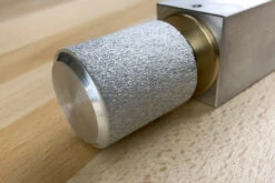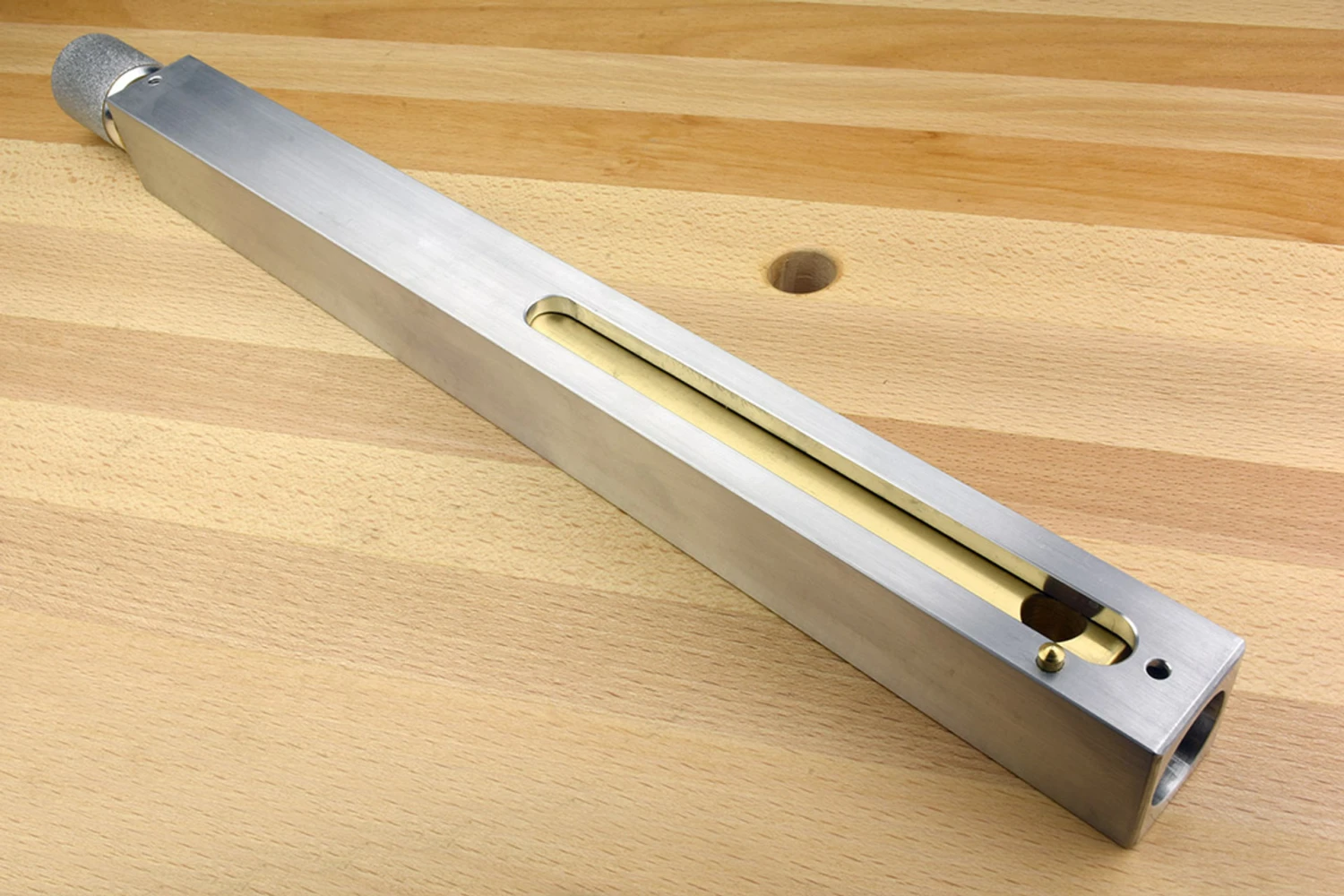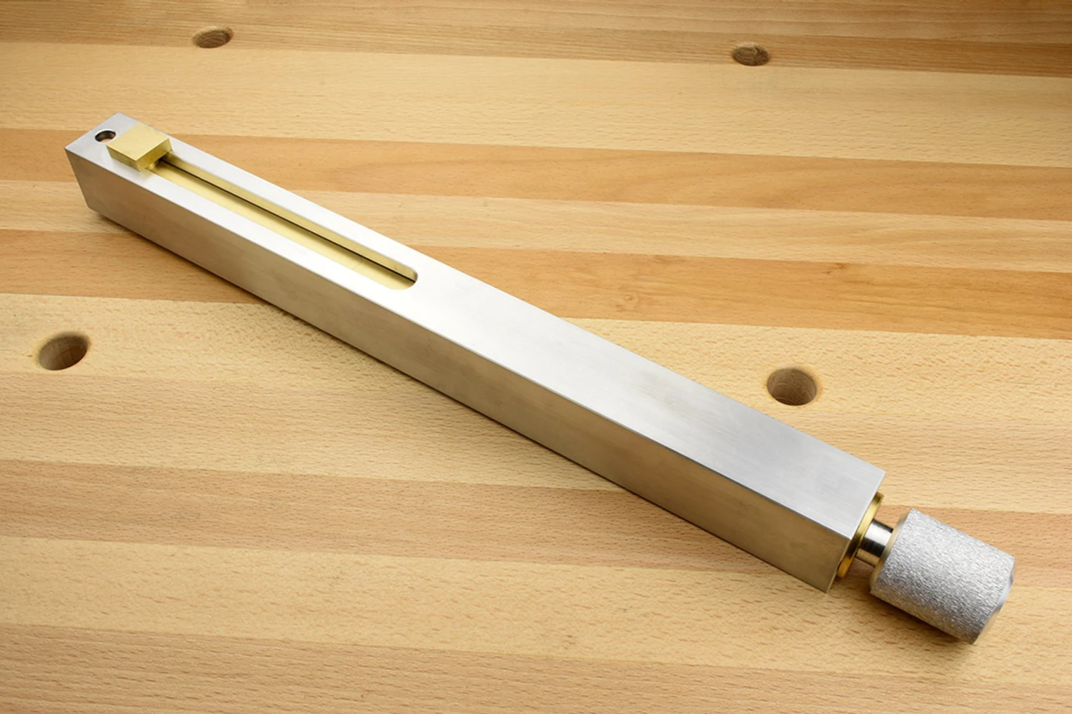 The HNT Gordon tail vice or wagon vice is designed to be completely enclosed in the benchtop, with just the knurled knob protruding from the side of the bench and a removable brass dog that drops into a slot from above. This unobtrusive design allows for any piece of wood to be lightly pinched against your dogs, sitting flat and fully supported on the top of your bench; this gives you easy access to the whole top surface of the board without losing the capacity to have the full flat bench surface available whenever you need it. The supplied ¼” height removable dog can be replaced with ones of different heights (available separately) depending on the work at hand. The dogs can also be used anywhere you can drill a half inch hole, so they’re quite handy things to have around. The 100mm version has less throw, so you need more dog holes, but the whole setup is a little bit faster to use. The 150mm version needs fewer holes in the bench but may take fractionally longer to adjust for different sized workpieces. Body: 32mm x 35mm x 370mm long ACME thread: ⅝” (15.8mm) 6 tpi for a quick moving action Travel: 150mm (just over) Comes with a ¼” high solid brass dog for low profile work Bench dog holes: 150mm or less apart Installation Guide included Weight: 1.6kg Manufactured in Australia You will need to cut a mortice in the benchtop and make a wooden cover plate to go over the top of the vice, the cover is then planed level with the top.
