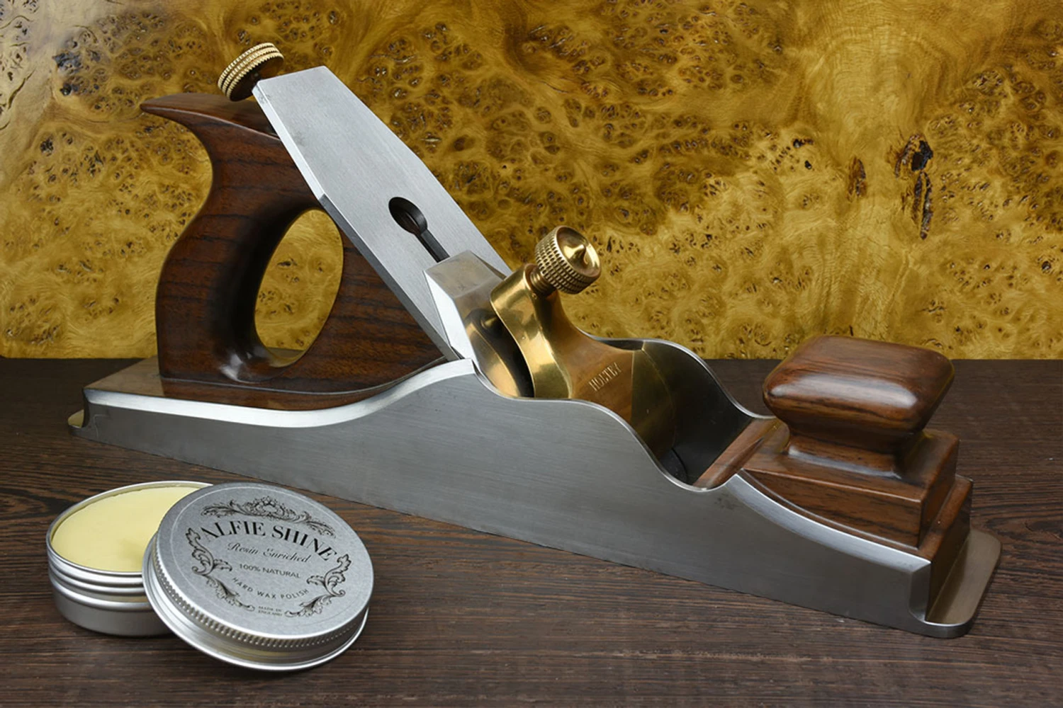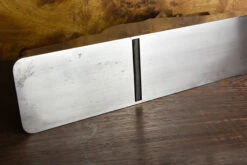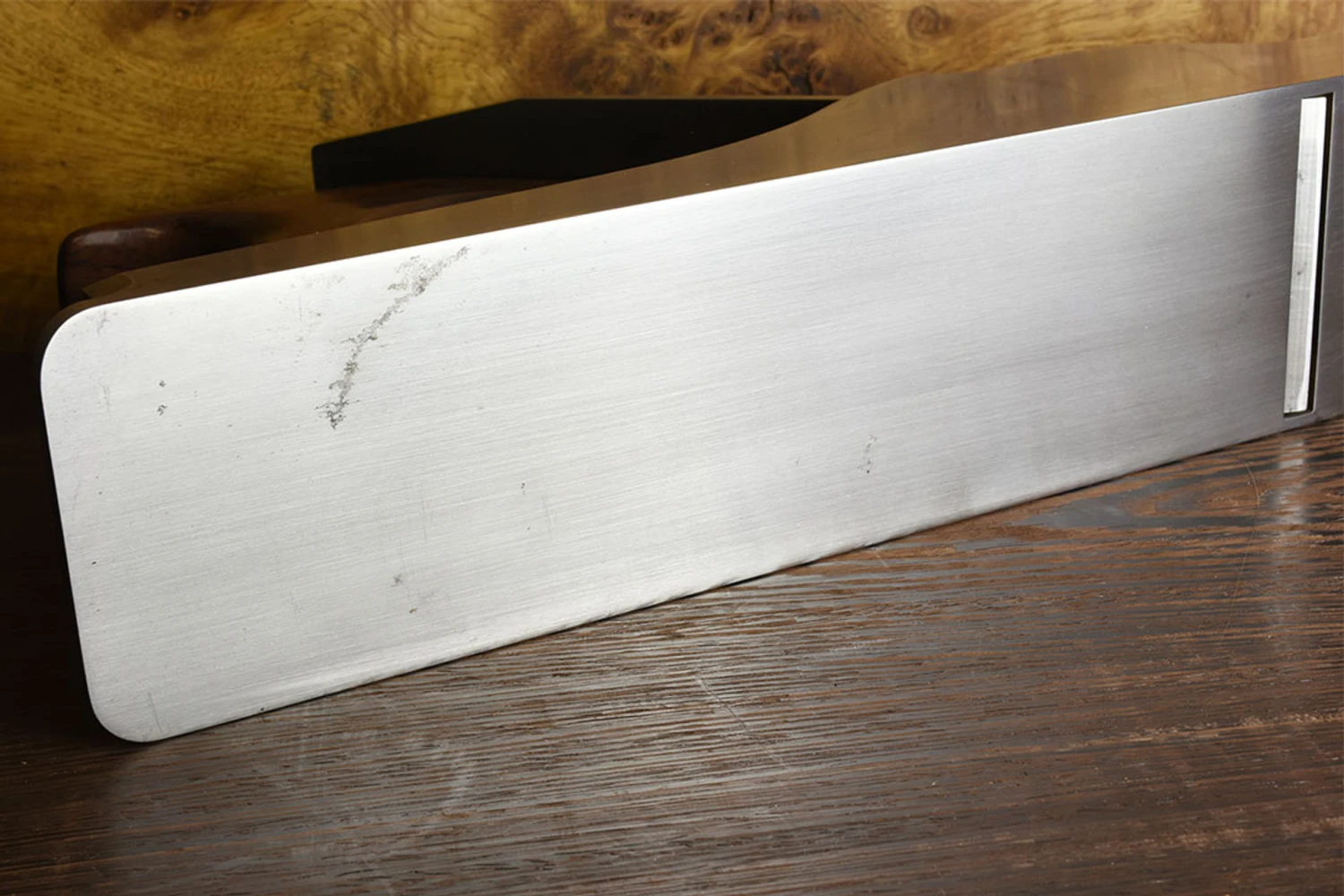 Long enough for flattening, refined enough to smoothing, the panel plane is the origin of the way modern furniture makers use jack planes set up as smoothers for preparing components to very fine tolerances.Styled after the Norris A1, the 14½” A1 panel plane was the first type of plane that Karl Holtey made. The body of the plane is constructed by dovetailing the sides to the sole and peining the metal to create a double-dovetail that cannot pull apart in either direction. Unlike the original Norris planes, the pins that hold the sides together run through metal spacer tubes in the infill, so that any movement in the wood cannot upset the metal body.Unusually this plane is stuffed with English Walnut, I believe this one to be a very early example as it doesn’t have the two brass pads on the bed and the Holtey mark is on the lever cap, rather than the top of the iron. All of the components are marked with the number 1. There are a couple of marks on the sole and although the blade has been honed, it retains Karl’s original precision grind on the primary bevel.Update:I have spoken with Karl and confirmed that this one is indeed the first plane that he ever made. It is offered as a collectors piece on the understanding that it doesn’t include the refinements of his later production work. Length 14½” Blade Width 2½” Width 2¾” This is a pre-owned item not covered by our Lifetime warranty – please see Terms and Conditions.