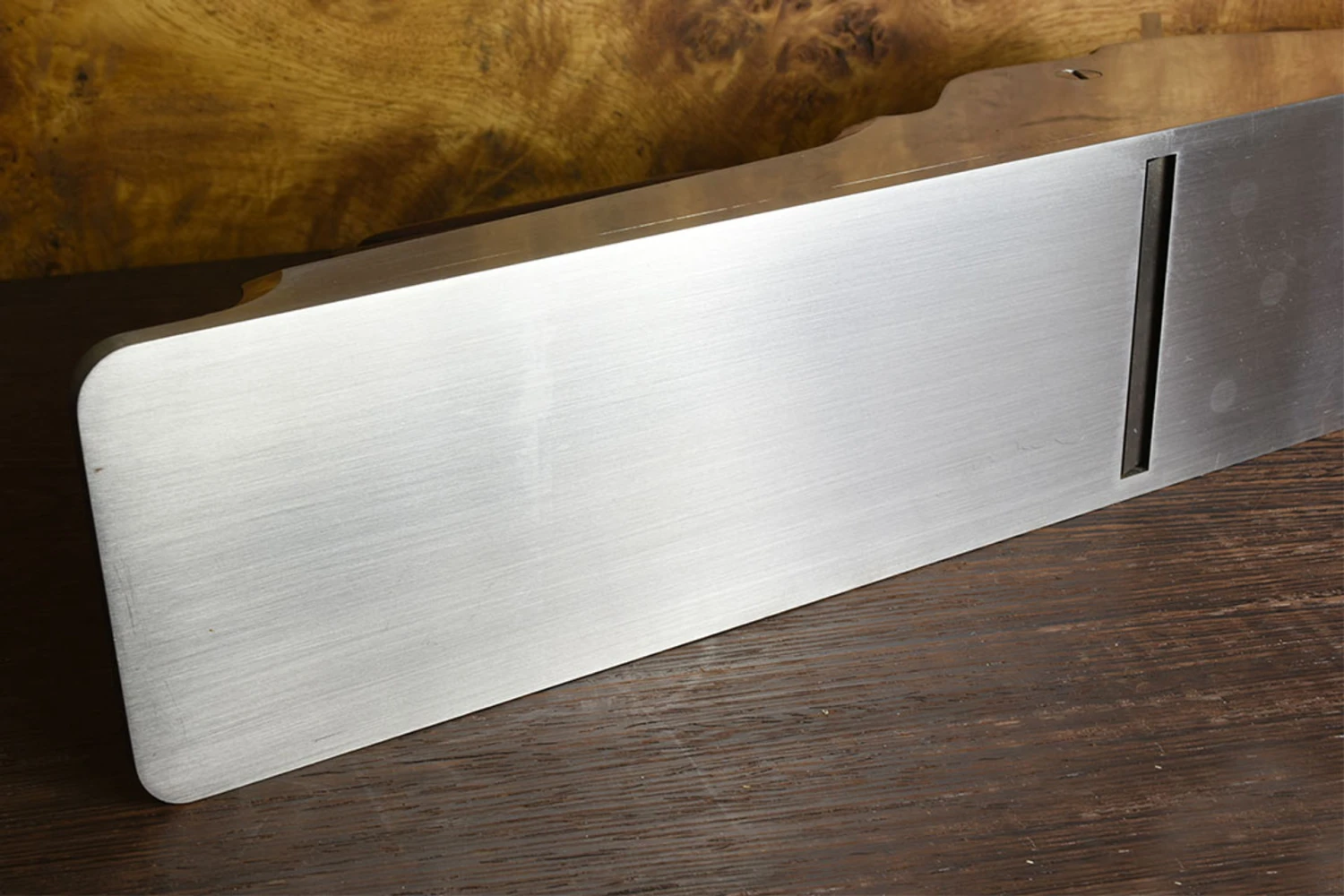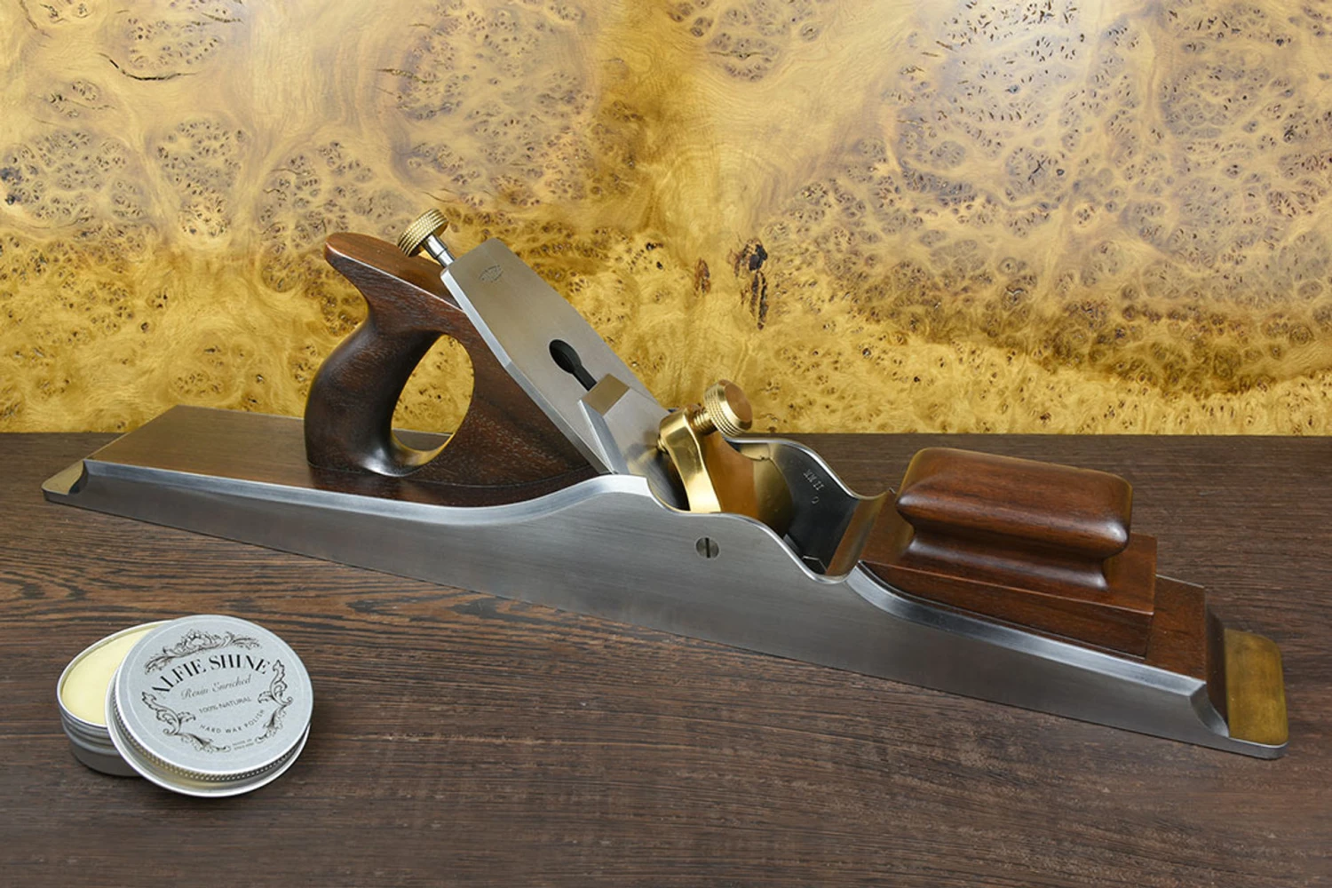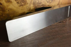 The 22½” A1 Jointer is the largest standard jointer plane in the Holtey range, only a very small number of longer jointers were made as special commissions.The double-dovetailed steel body is made in the Norris tradition with an immaculate and precisely fitted Honduran rosewood infill. The blade sits on two very precisely positioned and levelled brass pads let into the bed of the plane, like a minutely concave frog surface this arrangement ensures perfect and consistent stability.This example is in perfect condition, it has never been honed or used. It has been very gently cleaned (no abrasives) and protected with VanGuard corrosion inhibiting oil on the metal surfaces and Alfie Shine on the wooden infill. Length 22½ Blade Width 2½” Width 3″ This is a pre-owned item not covered by our Lifetime warranty – please see Terms and Conditions.