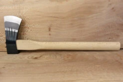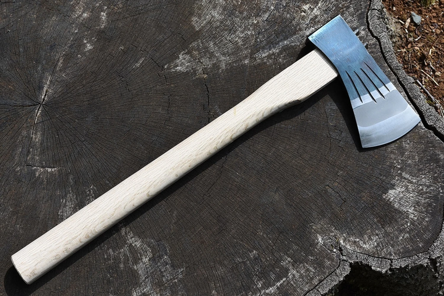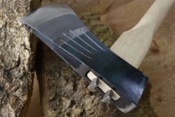 Light enough to carry into the forest, yet capable of felling and limbing small trees up to around 9″ diameter, splitting kindling or short straight grained rounds, the forest axe is a versatile general purpose tool for “if you can only take one axe with you” situations.Because this axe can be used for light splitting, the cheeks are important working surfaces too, so a solid steel head is used in preference to a laminated one. The steel is heat treated to be just on the tough side of optimum hardness, giving a good balance of strength, edge performance and durability. In essence the design and function are very similar to a European forest or hunting axe, but crafted with Japanese materials and techniques by a Japanese master axesmith.As well as being stronger and easier to replace in the field if necessary, the straight handle is comfortable to use for a wide range of tasks. Japanese axe and hammer handles have a tapered square section that can be planed to re-seat the head lower down if necessary.With many Japanese tools, the final step of preparation for use is left for the new owner to complete and these axes are no exception. The responsibility for ensuring that the axe head is secure always belongs to the person using it. These axes are intentionally supplied with the heads loosely installed and the wedges not driven home, the head must be secured by the user before use. In Japanese culture, if you are not ready to take that responsibility then you are not ready to own an axe.A couple of sharp blows with a hammer on the base of the handle (with the axe held in the air) to fully seat the head, soak the head in water for 20 minutes, tap the wedge home with the handle supported, and trim off the excess. You may notice some blackening of the wood after soaking, this is just the tannin in the oak reacting with the iron and is completely normal.Wood swells and contracts with seasonal changes in humidity, so it is good practice to check the head of any axe before use. If any movement is found, follow the above steps to properly secure it.Never hit an axe with a metal hammer.Never use an axe as a hammer.Always wear appropriate protection (safety specs).Always keep people and animals clear of your working area. Handle length: 400mm (15¾”) Head weight: 700g (1lb 9oz) Overall weight: 1050g (2lb 5oz) approx Cutting edge: 72mm (2⅞”)