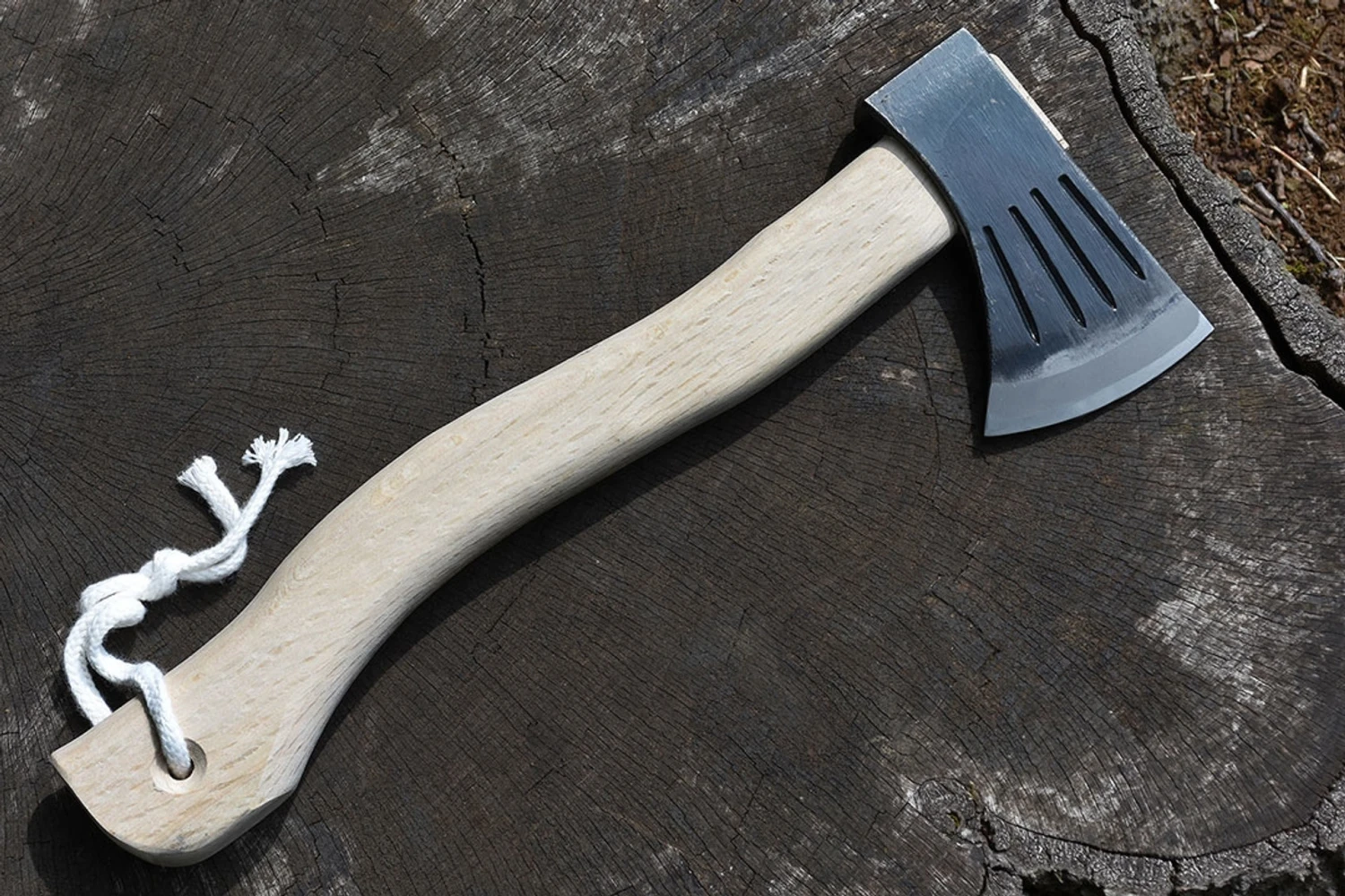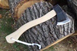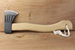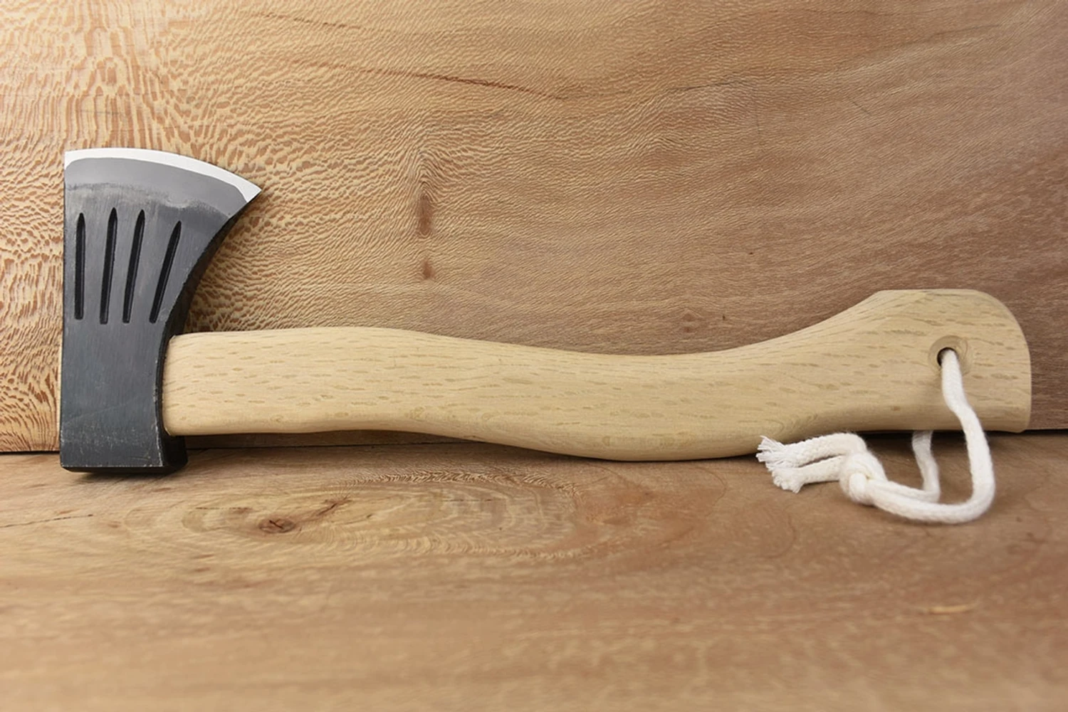 Used for light accurate work, splitting kindling, carving etc, a good hatchet should feel nimble and precise, a really good one will also take a razor edge and hold it for a decent length of time.This delightfully comfortable Japanese hatchet is as close to perfect as any small axe I have ever used. The head weight is the same as a typical 16oz claw hammer, being balanced further forward it feels a little bit heavier, but that should give you a fair approximation of what it feels like to use. The shapely Japanese white oak handle gives the optimum wrist angle in each of the three positions. As for edge performance; the only axes I’ve used that even come close are the old cast steel Marples or Brades axes.With many Japanese tools, the final step of preparation for use is left for the new owner to complete and these axes are no exception. The handle must be properly secured by the user before use.A couple of sharp blows with a hammer on the base of the handle (with the axe held in the air) to fully seat the head, soak the head in water for 20 minutes and trim off the excess. You may notice some blackening of the wood after soaking, this is just the tannin in the oak reacting with the iron and is completely normal.Wood swells and contracts with seasonal changes in humidity, so it is good practice to check the head of any axe before use. If any movement is found, follow the above steps to properly secure it.Never hit an axe with a metal hammer.Never use an axe as a hammerAlways wear appropriate protection (safety specs).Always keep people and animals clear of your working area.Handle length: 350mm (13¾”)Head weight: 450g (16oz)Overall weight:700g (24oz) approx