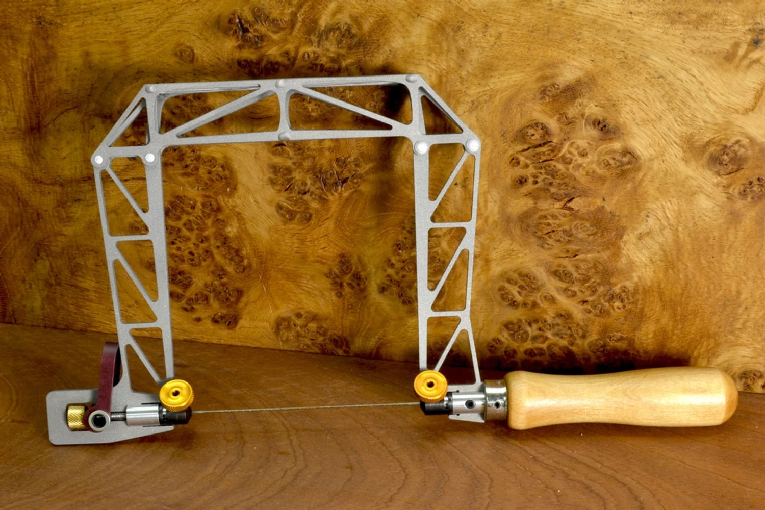 Knew Concepts titanium birdcage saws are the strongest, most rigid jewellers saw available on the market today! Its spine is a welded titanium beam, the blade is tensioned with a lever that can tension blades so tight they “ping”. The blade clamps lock at 45° left, 0°, 45° right.Knew Concepts recommend Pegas Swiss made sawblades and each saw is supplied complete with a Pegas No.11 skip tooth blade. This is a good blade for cutting wood up to 12mm or ½ inch thick.Given the extensive range of blades that are available for different thicknesses of wood, metal and other materials, your Knew Concepts saw is a very versatile piece of kit.Knew Concepts saws accept all plain ended 5 inch scroll saw blades up to 1.5mm deep.Please see our Pegas section for a selection of the more popular Pegas saw blades.Weight: 190g
