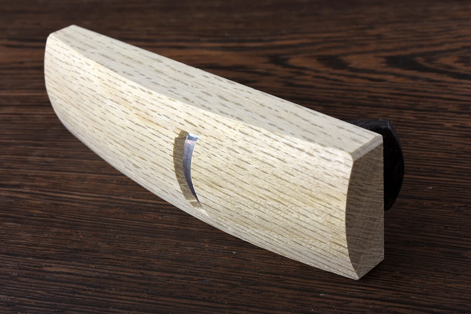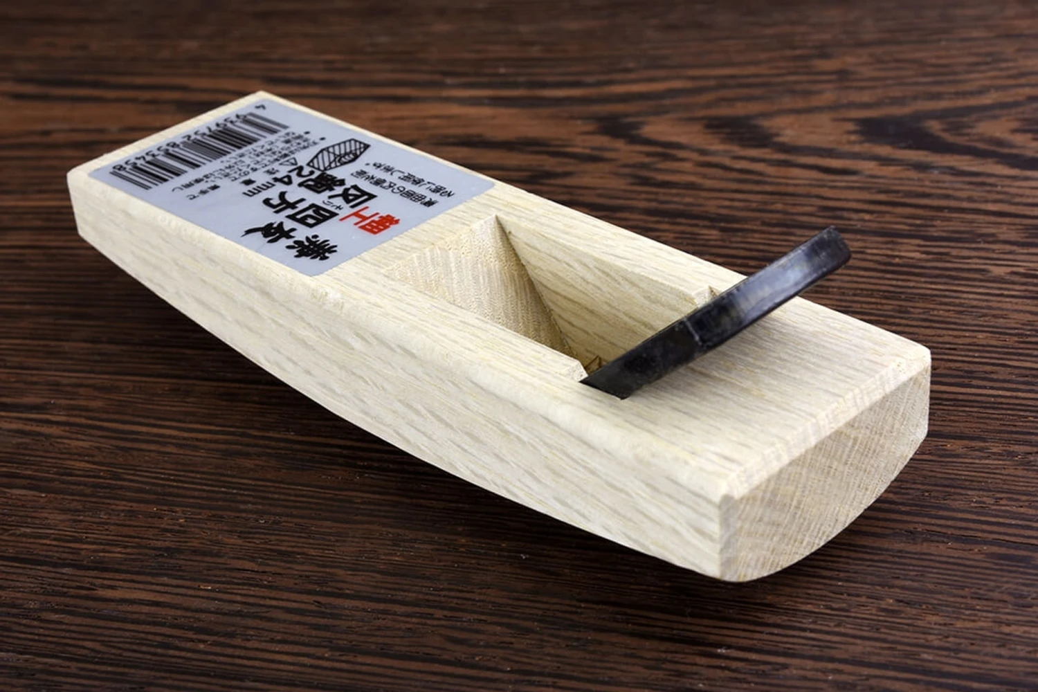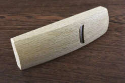 A double compassed hollowing plane, with a sole that is convex both in its length and width and a curved cutting edge. Used for creating dished surfaces – the underside of drawer pulls or the edges of a chopping board for example.You wouldn’t approach the whole job of forming a dished seat for a chair or bench with this tool, but it might come in handy for finalising the shaped surface. As with other fixed sole compass planes it can be used on surfaces up to and including its own curvature.Body length: 122mmBody width: 36mmBlade width: 24mmEdge Width: 24mmThis is an excellent series of videos by Sumokun that explains the process of setting up a Kanna in English (watch the first video, then the third, then the second).