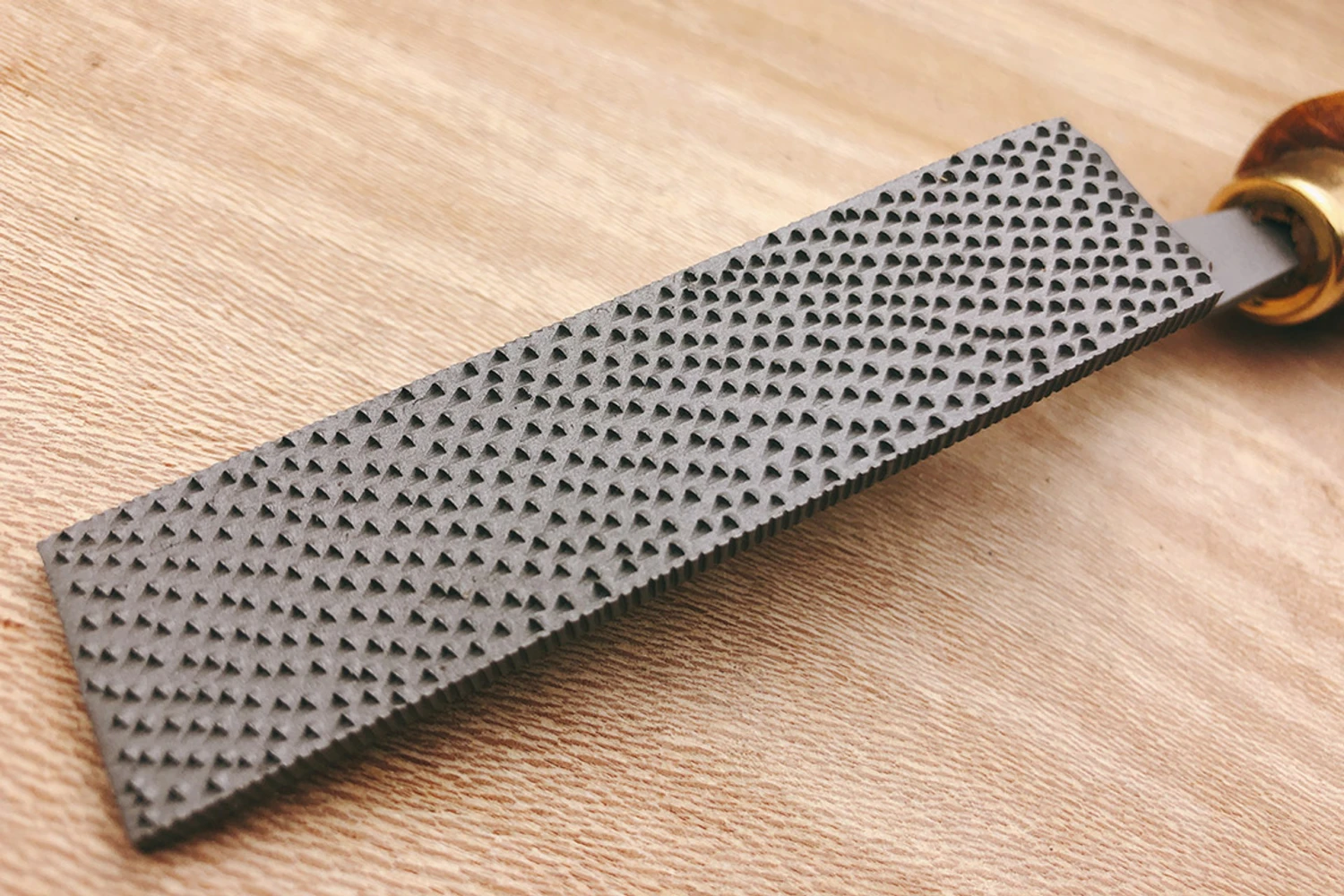 Ironing rasps are used for selectively dropping the middle of a flat surface away leaving proud areas that can be carved or shaped – think relief carvings, pie crust tabletops, or areas to be inlaid with veneer.After hogging away the majority of the waste with forstners, routers or gouges, the rounded ironing rasp will gently and efficiently gnaw away remaining material and the flat version (almost flat, they still have a very slight radius) will crisp up corners, work larger areas and produce a more level and even background.The necks are cranked to leave room for your fingers, the back of the tool is unstitched and can be used to lightly rest the fingertips of the opposite hand.Flat (ish) Version20mm wide x 80mm long x 3mm thick