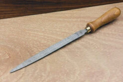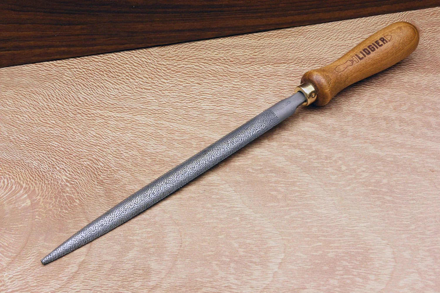 Modellers rasps are named for modélistes (pattern makers), also known as effilé (slender), they are unsurprisingly a slender halfround rasp traditionally favoured by patternmakers. The profile is a little bit narrower and fatter than a halfround, and quite a lot narrower and fatter than a cabinet rasp. They are lovely for creating tight radius roundovers where shapes meet, as you would when blending out any sharp corners in a casting that might provide origins for cracks in the metal as it cools. The key to a Liogier rasp’s performance is in the craftsmanship, meticulously perfecting each stage before moving on to the next. The blanks are beautifully forged, ground and polished before a stitcher even gets near them. The blank is treated with ever increasing reverence as more time is invested in it, and when the lengthy stitching process is complete, it goes on to the transformational stage of heat treatment where the crystalline structure of the steel is carefully reset into a hard, tough, and above all wear resistant material. Before it can receive it’s plump, narrow waisted beechwood handle, proudly marked with the Liogier logo, the newly created tool is gently wafted with compressed air and ground walnut shells to gently clean the steel to a smooth matte surface. The rasp is now ready to enter service with it’s new owner. It is important to keep your rasps free of wood debris that can attract and hold moisture against the surface. A brass bristled brush is the ideal tool for cleaning the teeth, for greater protection we highly recommend storing in an enclosed space with an open pot of Shield Technology ToolGuard VCI. Diameter: 11mm Thickness 3.5mm Grain No. 15