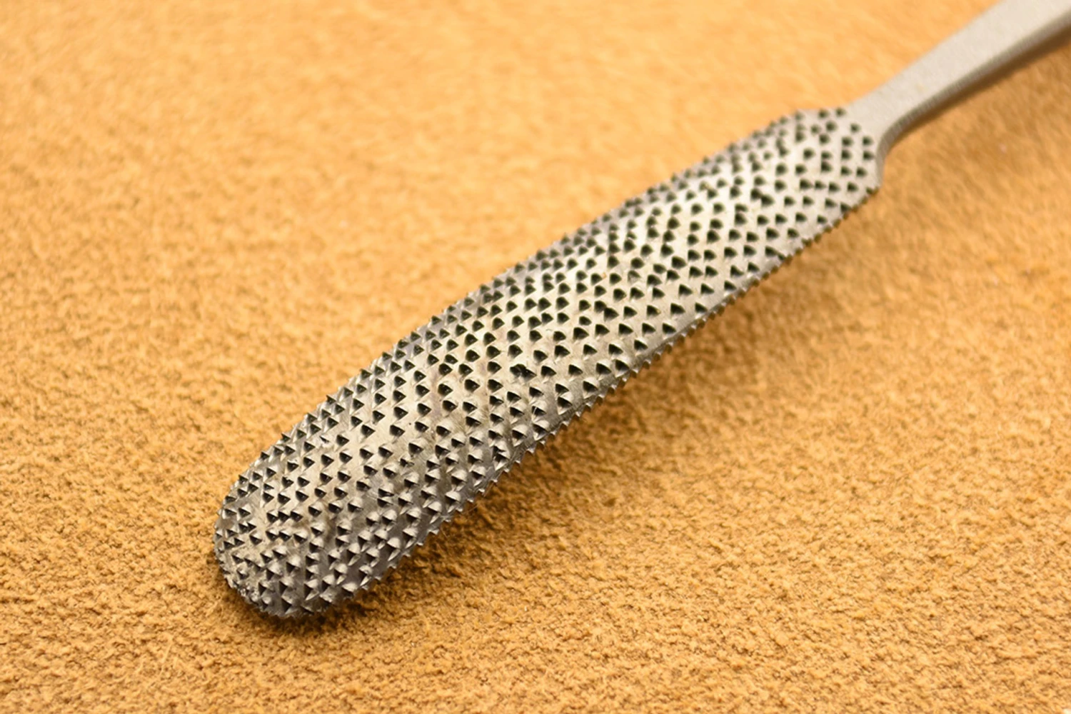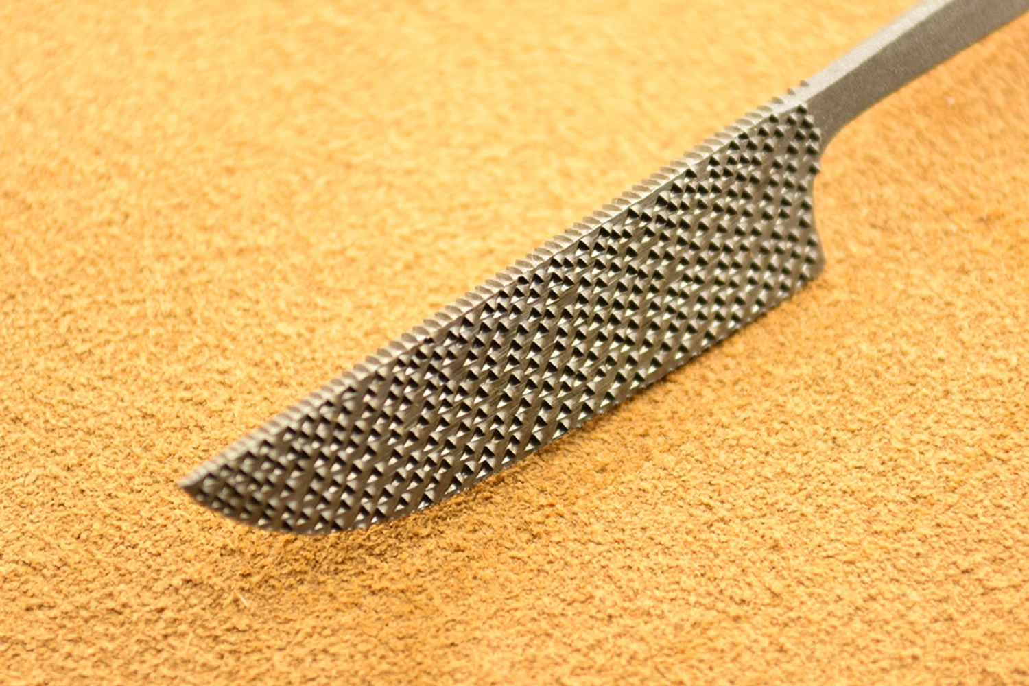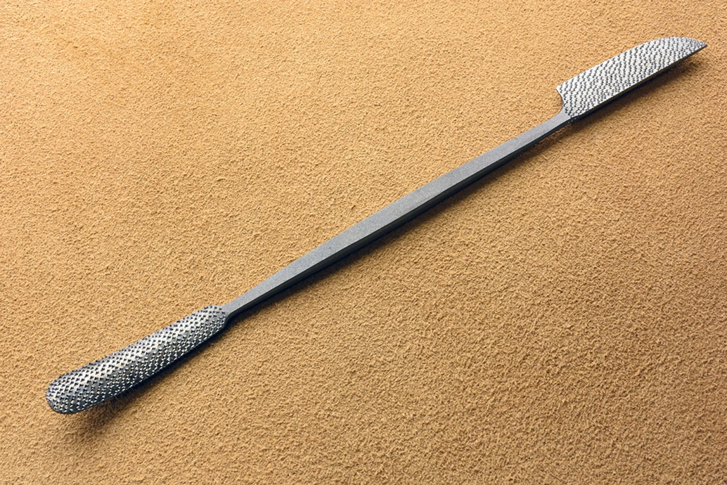 Liogier riffler rasps are a carver’s dream; light and delicate and wonderfully fine with densely stitched teeth for a superior finish.The No.1 riffler has a spoon on one end (similar to a thumb shape but wider at the tip) and a knife rasp at the other, the knife is lovely for creeping up on features and creating crisp dark shadow lines, the spoon is for working shallow curves and hollows making this quite a versatile choice for sculptural work.Overall length 175mmGrain 13
