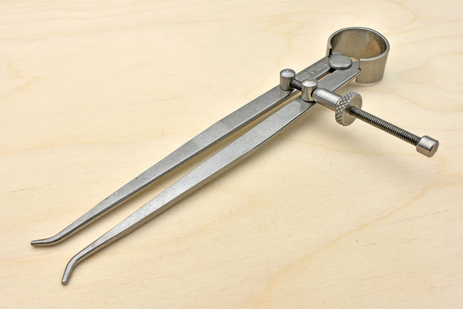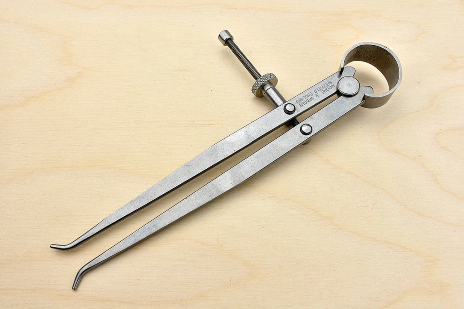 Moore & Wright internal spring calipers have a bow spring for uniform tension and a centrally located knurled adjustment wheel, to open and close the legs, for a finer setting than can be obtained with the firm joint type. 150mm Polished tool steel to B3123