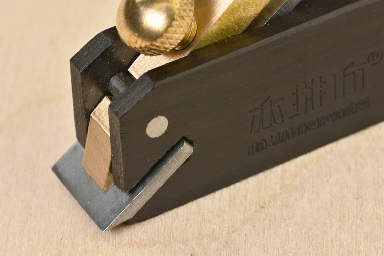 Small but perfectly formed, this little plane from Hong Kong based Mujingfang excels at cleaning up the ends of stopped rebates or housings where the nose of a shoulder plane or bullnose plane prevents it from cutting. The sole registers off the existing planed surface allowing the cutter to extend it all the way into the corner. Also handy for scribing from one panel to another, like a patternmaker’s mouse. Like a shoulder plane, the cutter is fractionally wider than the body allowing it to be laid on its side and set flush with either the left or right side. Body: Ebony Lever Cap: Brass Blade: W/V HSS RC63-64 Length: 80mm Width: 13.5mm Cutting width: 14mm