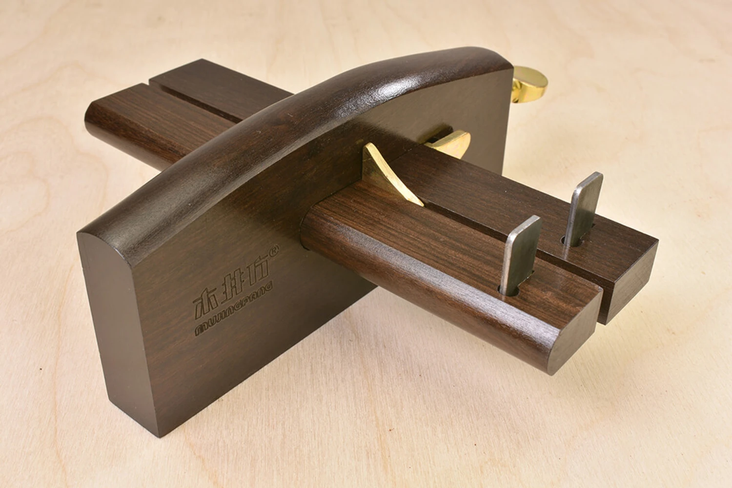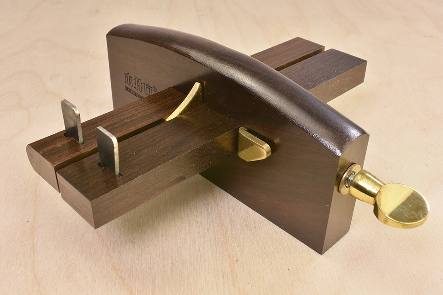 These marking gauges have a relatively large fence area, providing excellent registration against the workpiece. The stems on this model are secured with a brass twist lock at the front of the stock. Once the setting is established, small adjustments can be made by tapping the ends of the stem, either on the bench or with a small hammer. The front stem locates in a D shaped cut-out and remains fixed, there is just enough vertical play in the rear stem to lift its cutter into or out of engagement with the work, so you can have either line or both without losing your setting. Beautifully made from solid ebony with high carbon steel blades and brass fittings. Overall length: 135mm Capacity: 0 – 110mm