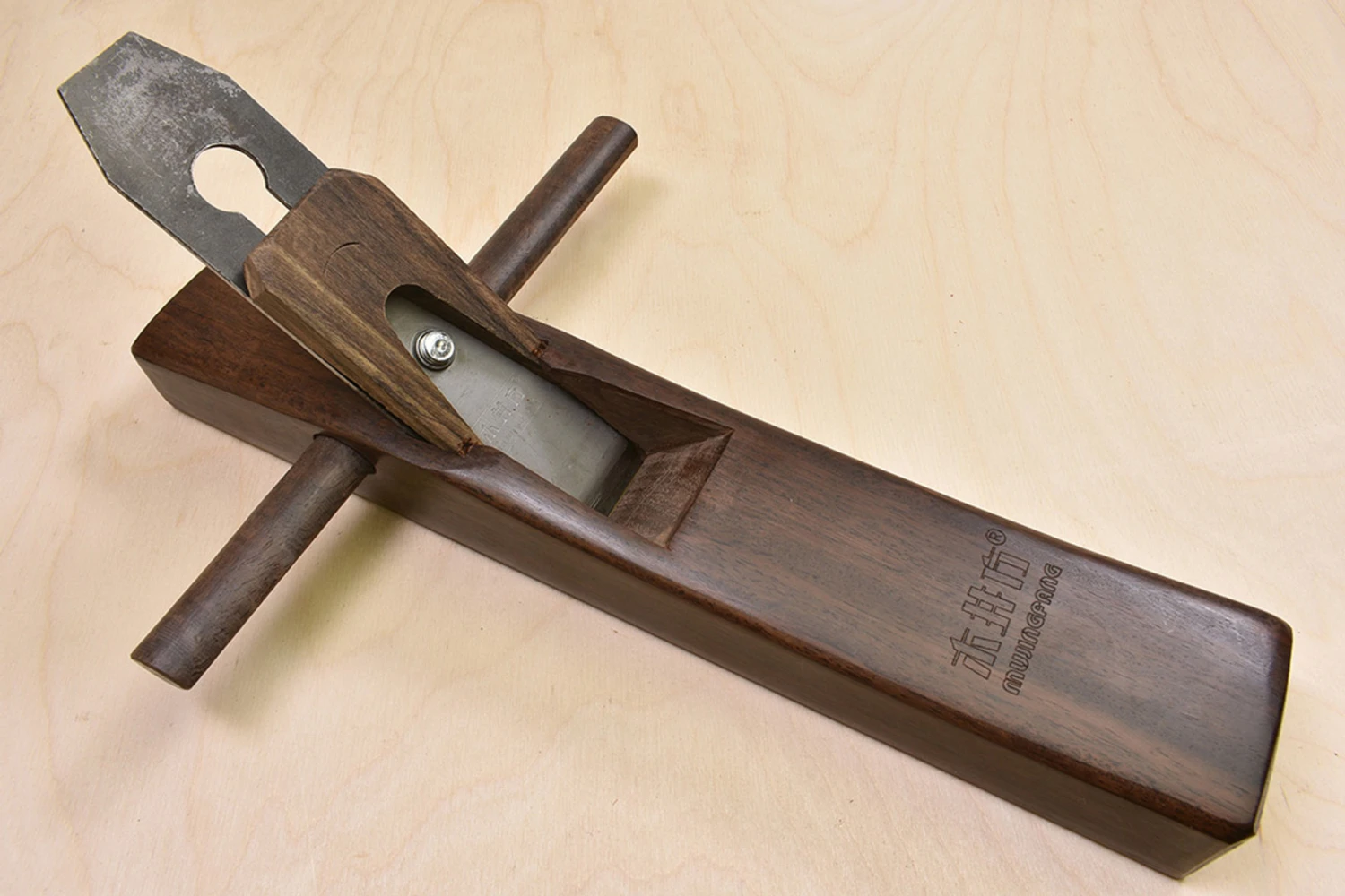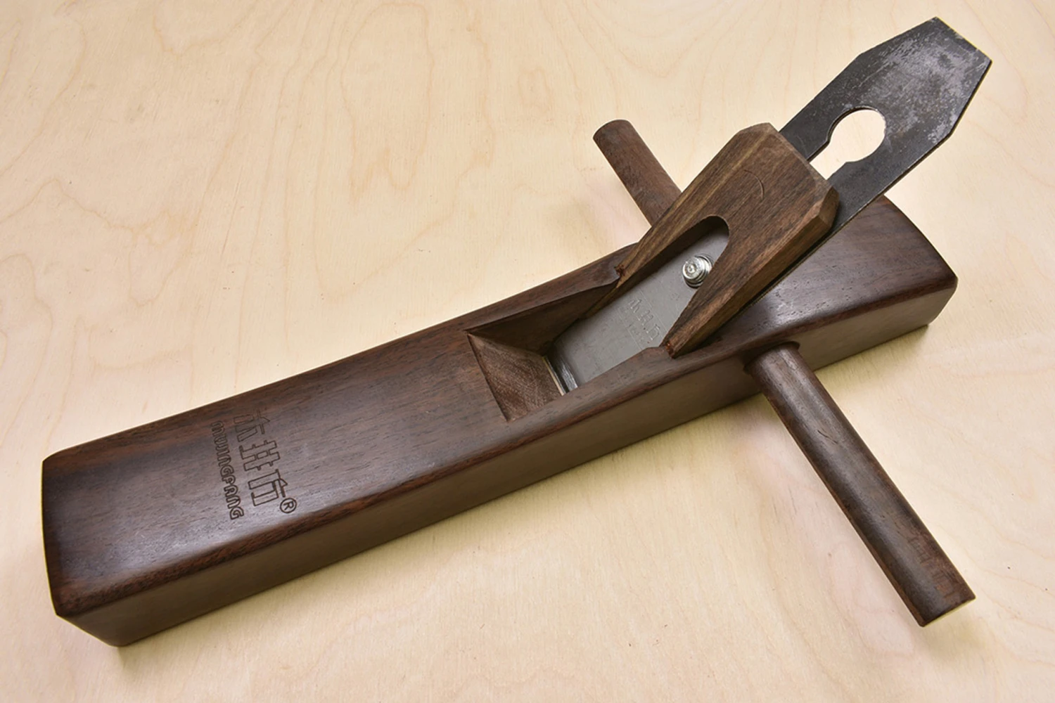 Hong Kong style planes have a wedged iron and chipbreaker that will be familiar to users of British wooden planes. Because the irons and wedge work in opposite directions they are considerably easier to set, adjust and maintain than other oriental planes. The try or truing plane is traditionally used after the jack plane to remove the scalloped finish and accurately flatten the surface of the board. They can also be used for jointing the edges of boards to straighten them or prepare them in pairs for gluing. Hong Kong planes can either be pulled or pushed, the through handle is used for pushing with thumbs crossed behind the irons, index fingers extended along the sides of the mouth pocket and the remaining fingers curled around the handle. The braized HSS iron is hardened to RC63-64, well below the RC70 that the steel is potentially capable of, but this lower hardness delivers a very pleasant balance of edge retention, sharpenability and toughness. Any standard 1-3/4″ iron, modern or old, will also fit. Length: 350mm Width: 58mm Bedding Angle: 42.5deg Iron: 1-3/4″ / 45mm braized HSS tip