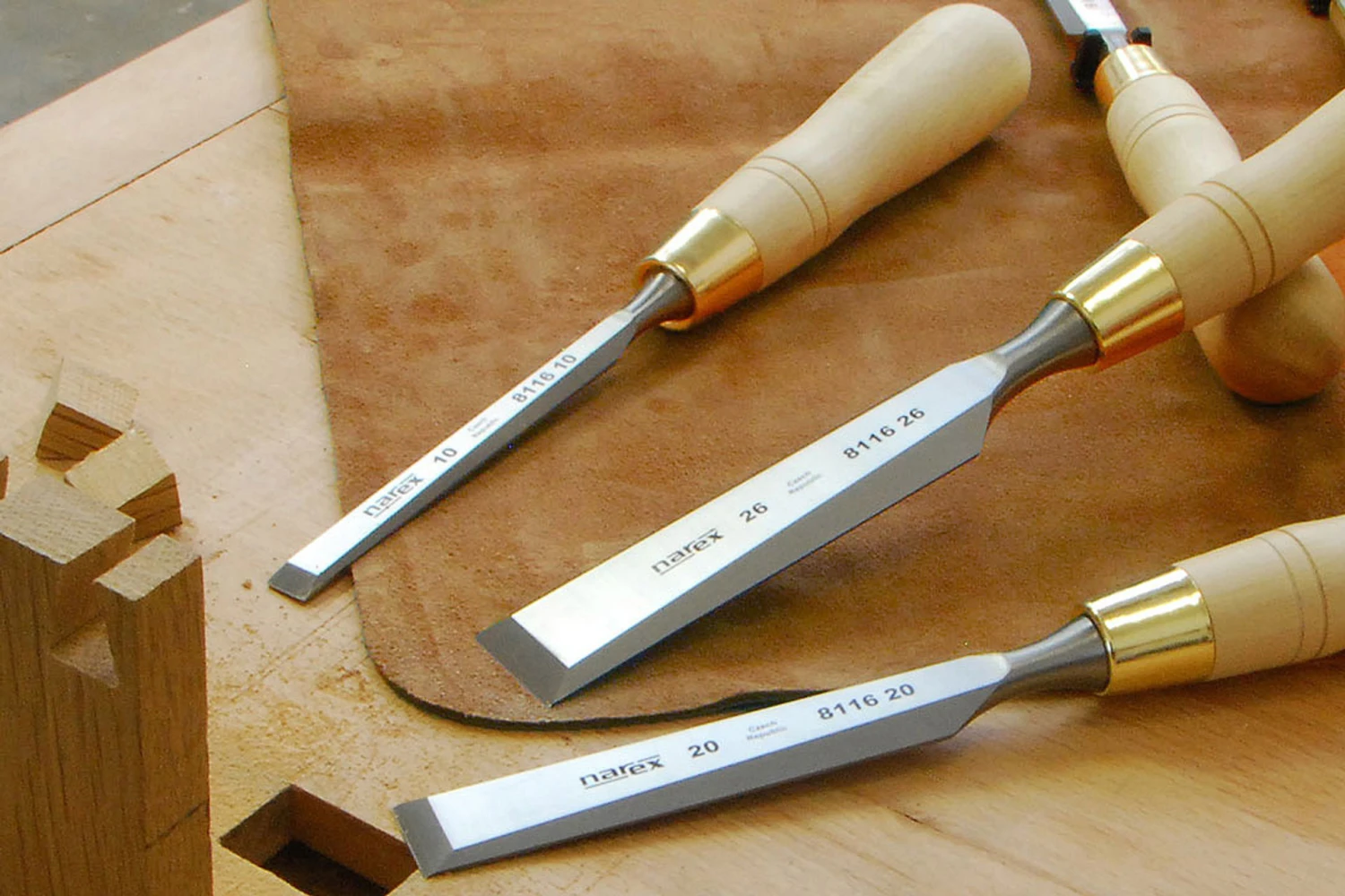 The 8116 series of Narex chisels are accurately ground, affordable, Cabinetmaker’s chisels with fine edges and close tolerance backs. We have found them to be the best value chisels accurate work but that doesn’t mean that Narex chisels are cheap, it means you get a lot more chisel for your money.Narex forge the chisel blades from Chrome Manganese (CrMn) spring steel and isothermally harden it to produce a very even and consistent bainitic structure at RC59 +/-1. In use, Chrome Manganese steel delivers similar performance to carbon steel but is more efficient to produce. The sides of the chisel are around 1mm with negligible lengthwise taper, giving excellent sightlines and good clearance for dovetailing throughout the life of the blade. The handles were developed from a shape that Narex last used on a range of chisels that they made in the 1930’s. They are turned from dense European hornbeam and fitted with a split-proof, self-tightening, plated steel ferrule and we have the slightly smaller handles for the 26mm and narrower chisels fitted just for us to refine their balance and feel – it is a subtle difference, but it’s enough to make them feel ‘right’ in the hand.They will withstand taps from a mallet without the surface becoming marred and uncomfortable to use when paring. The hornbeam handles are lightly waxed to protect the timber whilst retaining its and natural colour and feel. Chisel Width 3 – 10mm 12 – 26mm 30mm 40mm 50mm Overall Length (approx.) 260mm 265mm 285mm 300mm 310mm Blade Length (approx..) 100mm 100mm 105mm 112mm 122mm Handle Length (approx.) 135mm 135mm 145mm 145mm 145mm