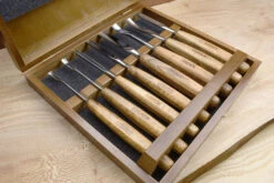 Set contains: Straight 4mm – Profile 11 Straight 8mm – Profile 41 Straight 12mm – Profile 3 Straight 16mm – Profile 7 Bent 12mm – Profile 5 Spoon 4mm – Profile 8 Spoon 4mm – Profile 9 Spoon 12mm – Profile 7 Light, delicate, and beautifully balanced, the profi range of CrMn carbon steel carving chisels are Narex’s flagship carving tool range and a source of great pride for the craftsmen who make them. Each tool is ground from the forged blank by hand, along with the unrivalled finesse and refinement that this brings you may also notice the lovely little irregularities that are the hallmark of handmade tools. All of the edges are nicely eased and with their classic ‘barrel octagon’ handles these tools feel wonderful in the hand. Supplied in a wooden box, the set of eight includes a broad No.7 for establishing shape, three spoon chisels in progressively narrower and deeper sizes, a V tool, a veiner, a medium bent gouge and a shallow finishing gouge. Ideal for those just getting into carving, be it flat relief work or sculpture in the round, this is an excellent selection that will cover your needs and give you enough of a grounding to understand which tools you may wish to add in future.