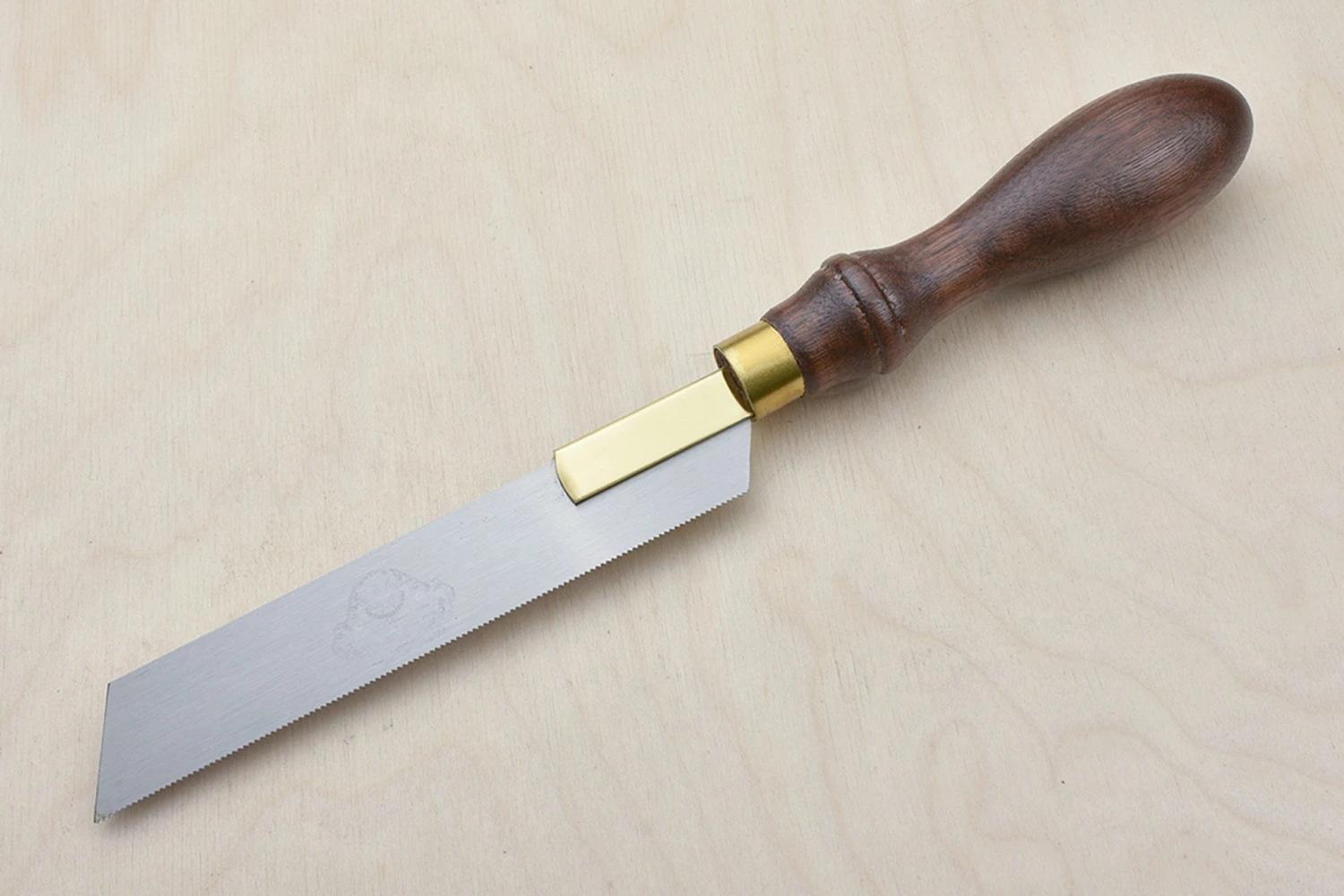 The Pax Flush Cutting Saw is a very bendy pullsaw with unset teeth. The saw cuts on the pull stroke.The 0.4mm thick blade, pressed lightly against the surface with the fingertips, will trim dowels, pegs and through tenons perfectly without leaving scratches.Steel blade, Mirror polished brass back spine with Walnut Handle.20 tpiOverall Length: 305mm (12.00″ approx)Cutting Length: 160mm (6.29″ approx)Handle length: 135mm (5.31″ approx)Useable blade depth: 25mm (0.98″ approx)