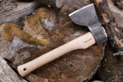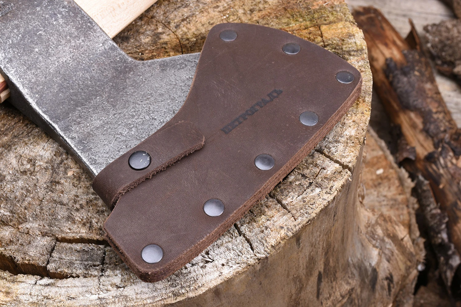 DISCONTINUED LINE All profits from sale of remaining stocks will be donated to @decappeal to help people affected by the conflict in Ukraine. For more information visit the DEC Appeal website. Based on historical examples from the 18th / 19th century, Pleskov side axes have an asymmetric head and handle and a single bevel, they excel at creating flat surfaces. For smaller pieces they are usually used with the wood resting on a stump and a series of chops made working up the log to break up the waste before slicing down to separate it. They can also be used on larger pieces in the same manner as a broad axe for smoothing and evening up. All Petrograd axe handles are secured with wooden wedges only, if the eye of the head has been formed correctly metal wedges are not necessary. The ‘left’ is left bevelled for use in the left hand. Supplied with a handmade welted and rivetted leather axe mask. Weight 1.05Kg Overall length 400mm Head length 70mm Cutting edge 120mm Replacement Handle N17