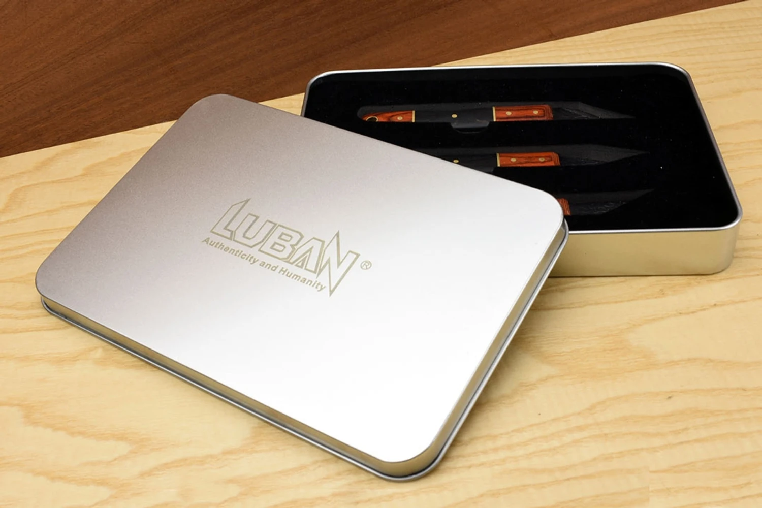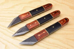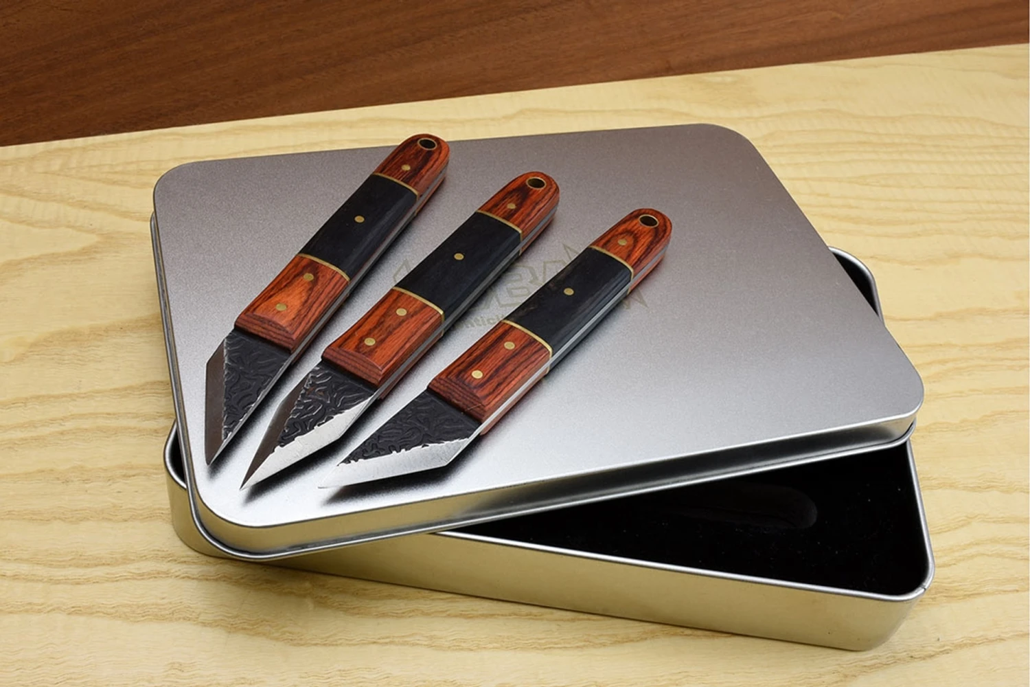 A set of three woodworking knives made from M2 tungsten molybdenum steel, hardened to RC 59-62.The hafted handles are made from pakkawood – a resin stabilised wood composite, with solid brass rivets and spacers.The set includes left bevel and right bevel which are very acceptable marking knives but are also ideal for carving and shaping or for making heavier cuts in leather or veneer. The spear point has shallower bevel angles and is an excellent marking knife for laying out joinery.M2 is often used at somewhat higher hardnesses for woodturning tools, where it’s excellent abrasion resistance provides superior edge retention.Supplied in a presentation tin.Also available individually.