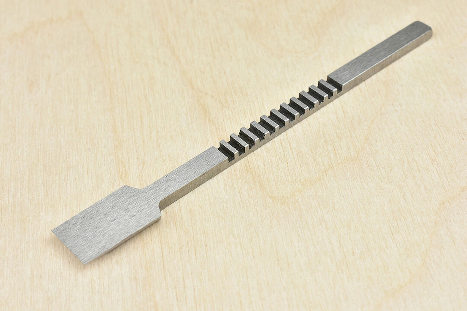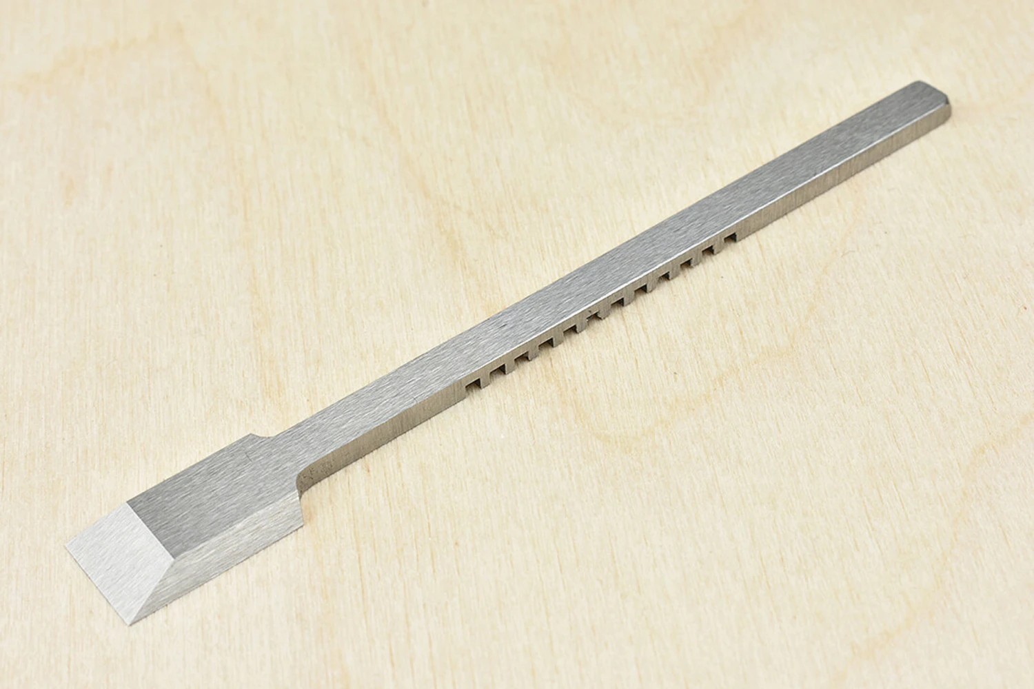 Replacement blade for Quangsheng No.91 small shoulder planes.Precision ground from T10 high carbon steel, quenched in distilled water and tempered to RC61-62 for superb edge taking.Supplied ground with a single 25 degree bevel, for general work we recommend honing a secondary bevel at 30.Overall Length: 111mm (4.37″ approx)Useable Width:12mm (0.47″ approx)Upper Width: 6mm (0.23″ approx) Thickness: 3.13mm (0.12″ approx) Please note that we are unable to ship Quangsheng products to North America due to retail exclusivity restrictions.