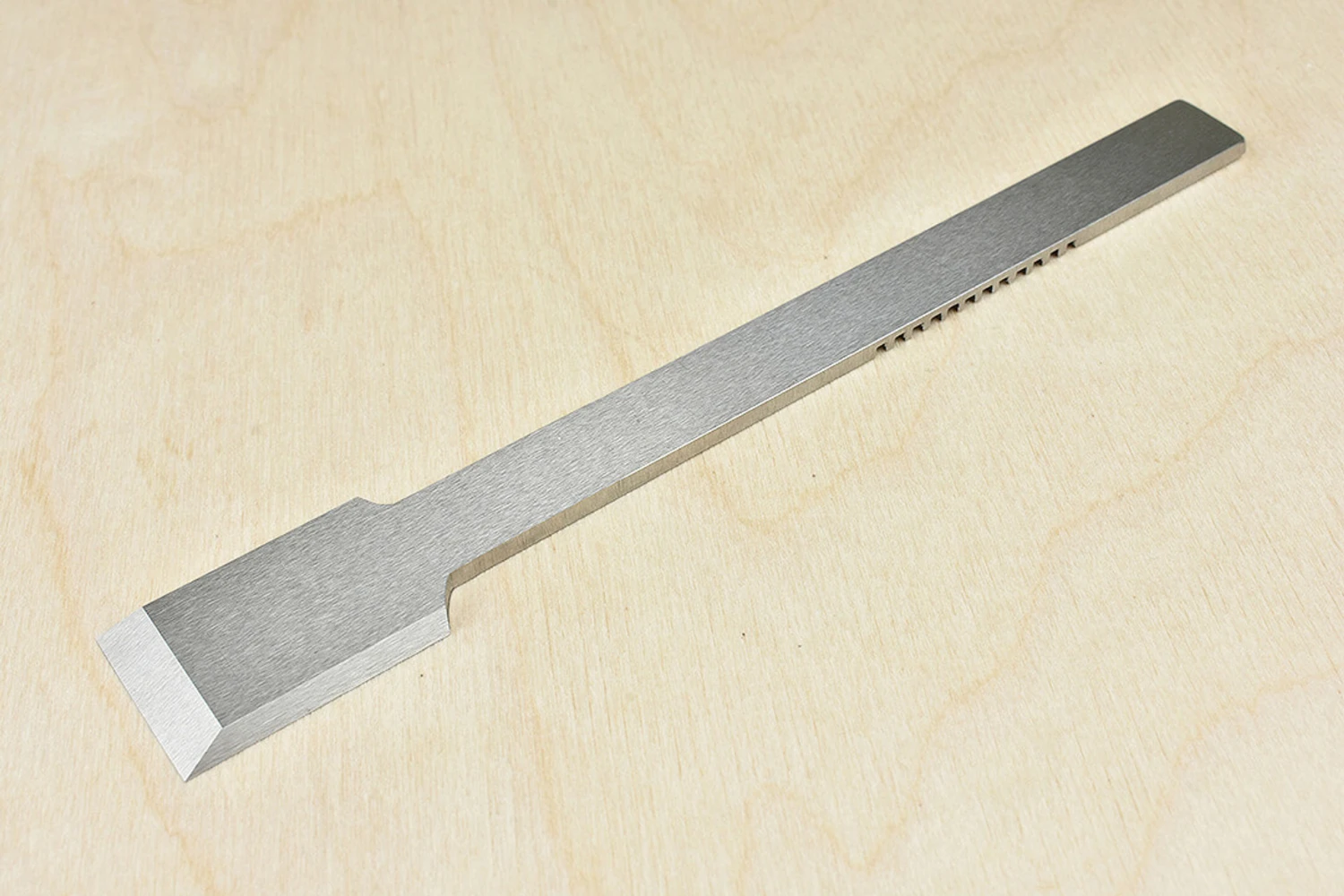 Replacement blade for Quangsheng No.93 large shoulder planes.Precision ground from T10 high carbon steel, quenched in distilled water and tempered to RC61-62 for superb edge taking.Supplied ground with a single 25 degree bevel, for general work we recommend honing a secondary bevel at 30.Overall Length: 171mm (6.73″ approx)Useable Width: 25mm (0.98″ approx)Upper Width: 19mm (0.74″ approx)Thickness: 3.13mm (0.12″ approx)Please note that we are unable to ship Quangsheng products to North America due to retail exclusivity restrictions.