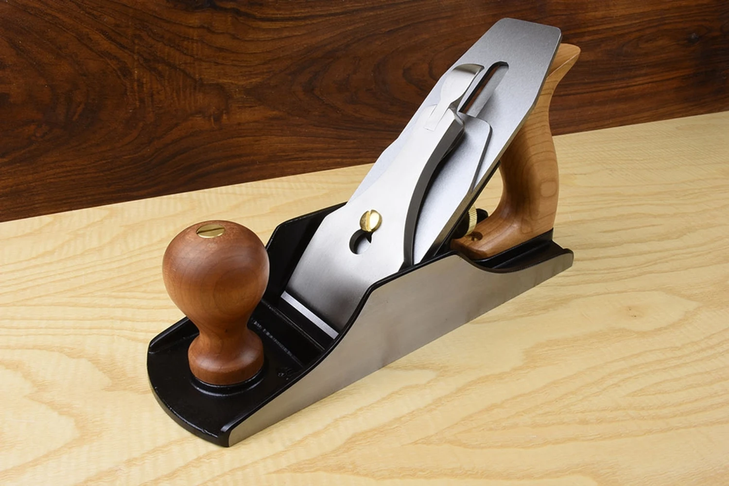 Larger and heavier than a No.4, the Quangsheng No.4½ smoother takes the same broad 2⅜” iron as the 5½ and 6.Aside from the convenience of interchangeable irons, the main benefit of a large smoothing plane is that you can take a broader shaving, so it covers more ground in fewer passes than a 4 or 3. The other advantage is its weight – at just under 6lb it has plenty of mass, giving it the same planted feel as an infill plane.Quangsheng bedrock pattern handplanes, unlike the more common Bailey pattern, have a full contact area between the body and the frog, hence the name ‘bedrock’. The frog can also be adjusted to widen or narrow the mouth of the plane without the need to remove the irons. Simply loosen the two locking screws on either side at the back of the frog, adjust the central screw to set your desired mouth opening and then nip up the side screws again. This system is easier, faster, much more accurate, and less likely to damage the cutting edge.Specifications: Precision ground, unbreakable CR40 alloy steel casting Engineered lateral adjuster with guide bearing and brass tab Low profile cap iron Brushed finish stainless steel lever cap Hardwood handles. Conforms to British Standard Sole Dimensions 10⅜” x 2⅞” (265mm x 72mm) ⅛” (3mm) thick 2⅜”(60mm) cutting iron made from T10 carbon steel hardened to RC63 Please note that we are unable to ship Quangsheng products to North America due to retail exclusivity restrictions.