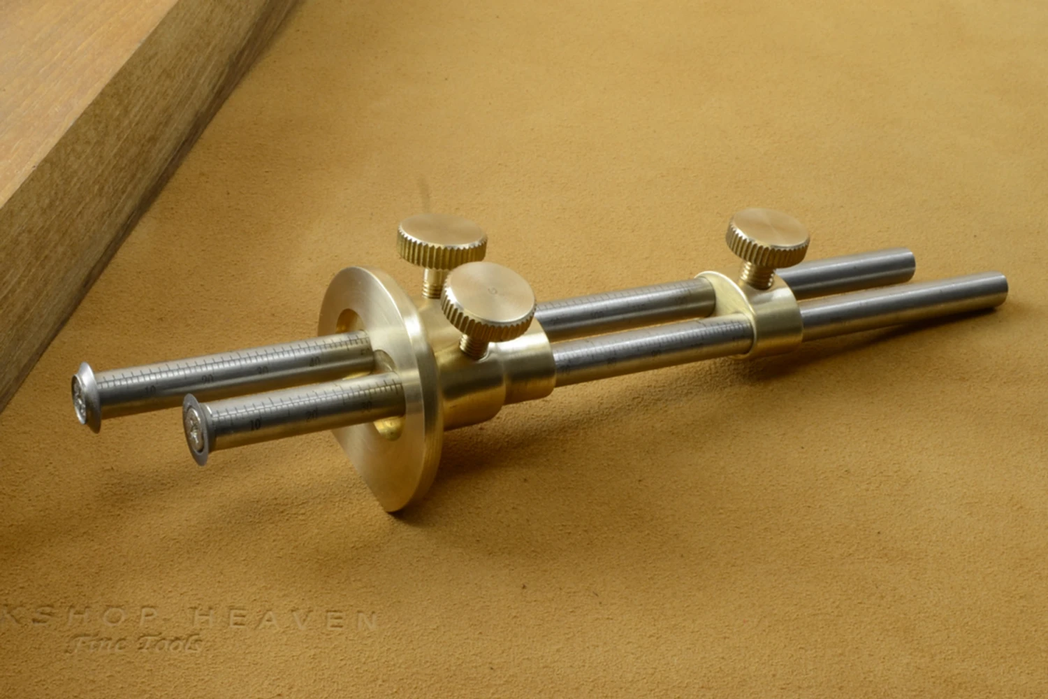 This superb solid brass twin stem gauge from Quangsheng has a couple of very useful features.The bridle at the back is designed to hold the setting of the cutters relative to each other while the fence is adjusted independently, or vice versa if you want to adjust one rod but leave everything else set.With both cutters set to the same line and the bridle locked, you can use it as a standard marking gauge but with the option for which side you would like the bevel on.Thanks to the clever shape of the casting, the bridle can also be used ahead of the fence to stabilize the bars for cutting marks further in from the edge. In the horizontal position the cutters won’t engage – rotate into the vertical position and the thinner wall of the saddle casting lowers the cutter into the work. A very controlled way to lay difficult marks.For a tool that is produced in volume, the cleverness of design, ease of use and overall finish on this gauge is remarkable. Please note that we are unable to ship Quangsheng products to North America due to retail exclusivity restrictions.