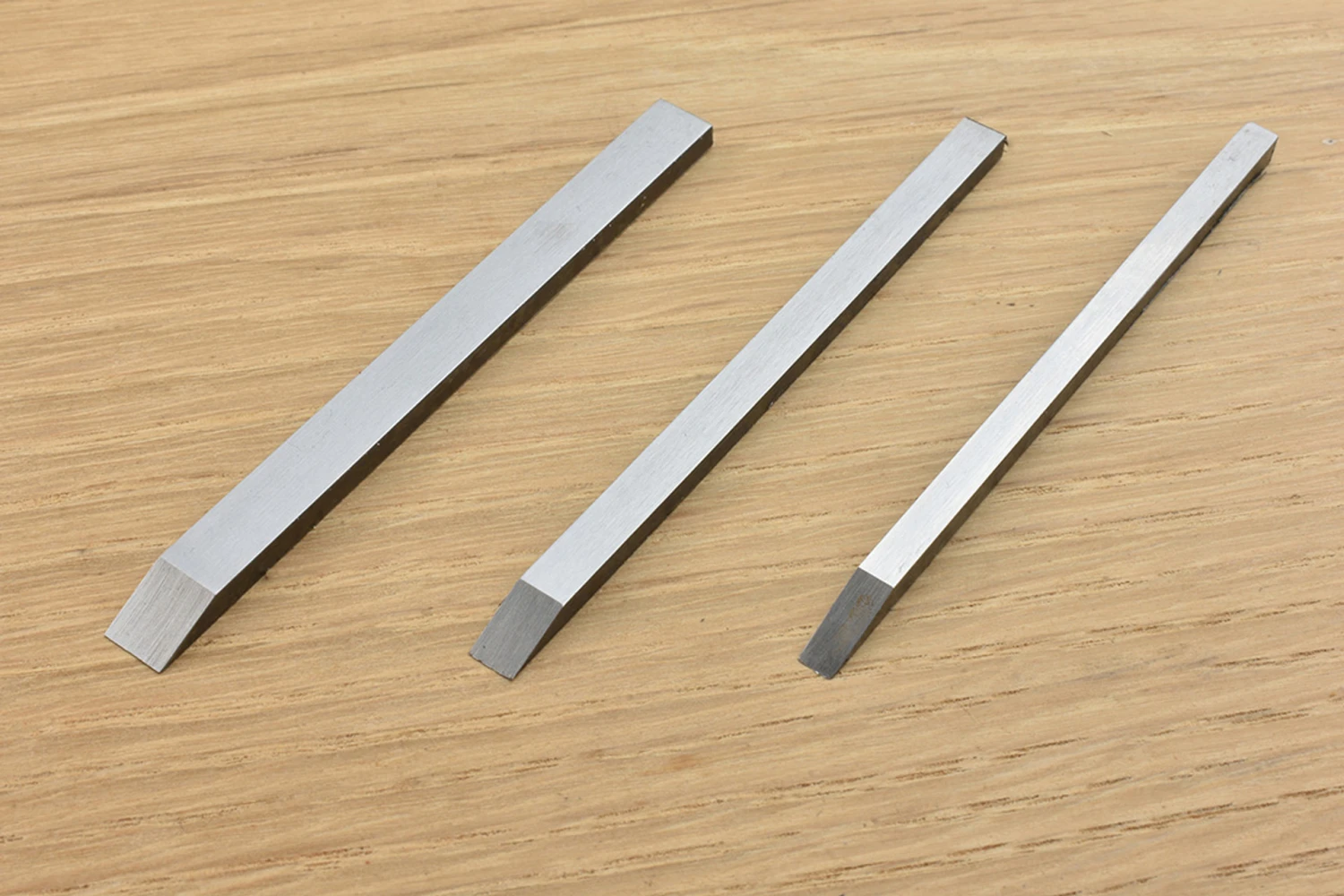 Ray Iles RI011 set of three cutters for Record 043 plough plane. O1 carbon steel hardened to RC59-61. Widths: ⅛”, 3⁄16″ and ¼” Thickness: 3.66mm Lengths: between 3.5 and 3.7 inches (the wider blades are longer)