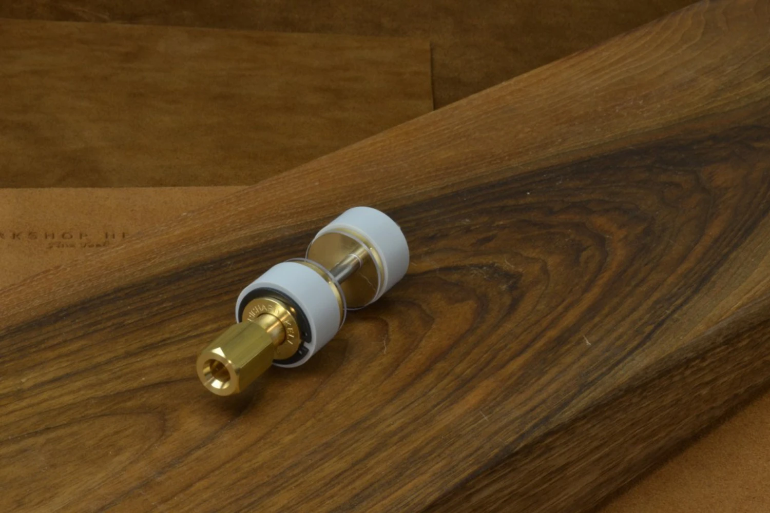 Designed to produce consistent, controllable results on blades up to a width of 1 inch, the Richard Kell No. 1 honing guide is a really cleverly engineered piece of kit. A pair of polycarbonate washers grip the blade from the sides whilst the back of the blade registers against a pair of stainless steel rods. This unique arrangement uses the correct face of the tool as the datum for the bevel angle and allows tapered blades such as those found on Japanese chisels to be honed accurately.The Ertalyte rollers are machined in pairs and run on brass bobbins, selectively assembled in pairs to within a tolerance of one third of a thou.All of Richard Kell’s honing guides come with a copy of his wonderfully clear set of handwritten instructions, complete with neatly drawn diagrams, that leave you in no doubt that your honing guide was made by a man for whom precision is as essential as breathing.Capacity: 0 to 1 inch width (25mm).