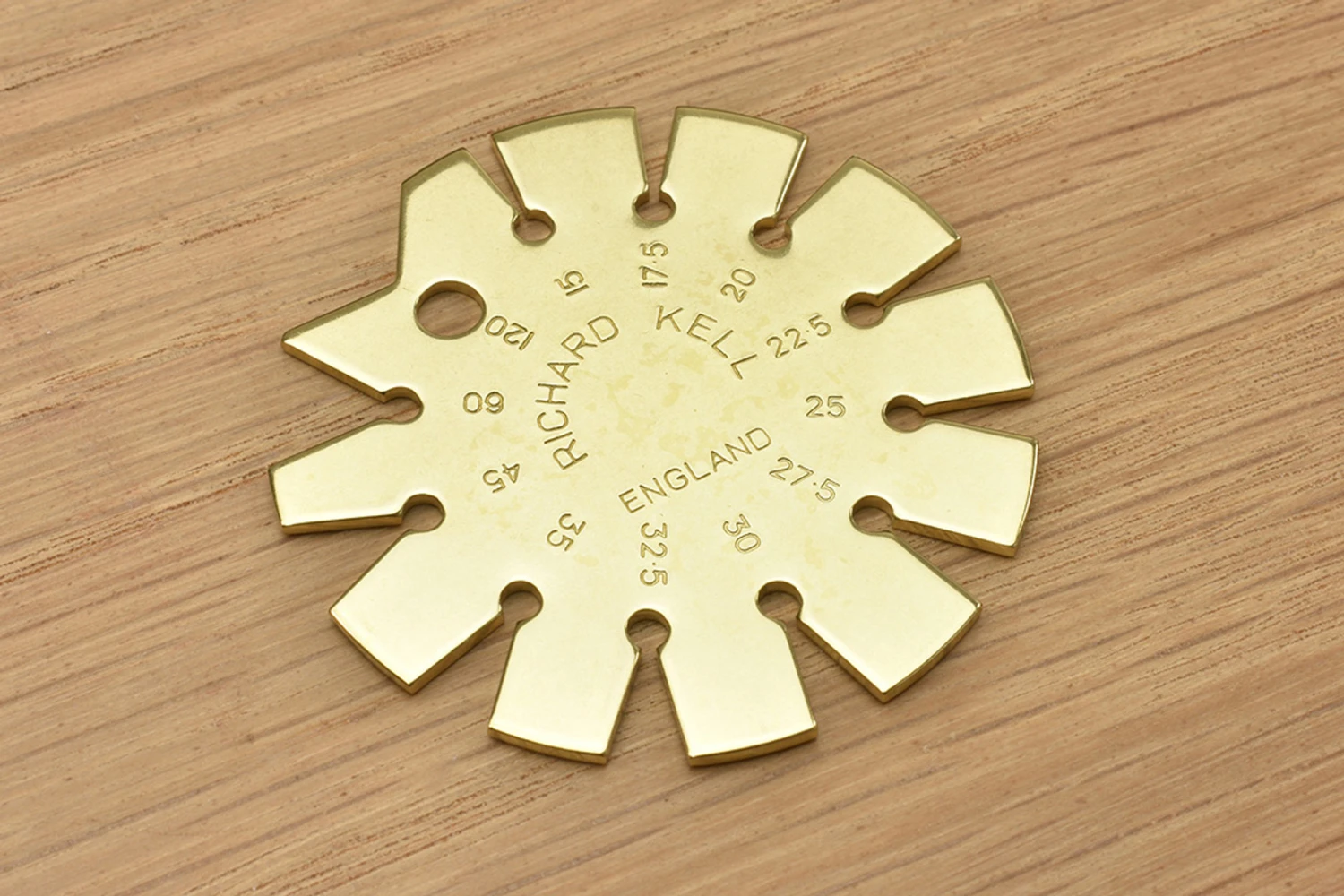 The original Richard Kell bevel gauge has now been in continuous production for over twenty years. This delightful little gadget accurately measures the bevel angles of chisels and plane irons, indispensable for freehand sharpening.The twelve accurate angle cut-outs have the apex cut away to prevent damage to prepared cutting edges.Angles (in degrees): 15, 17.5, 20, 22.5, 25, 27.5, 30, 32.5, 35, 45, 60 and 120Overall diameter: 2″