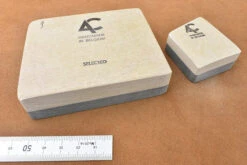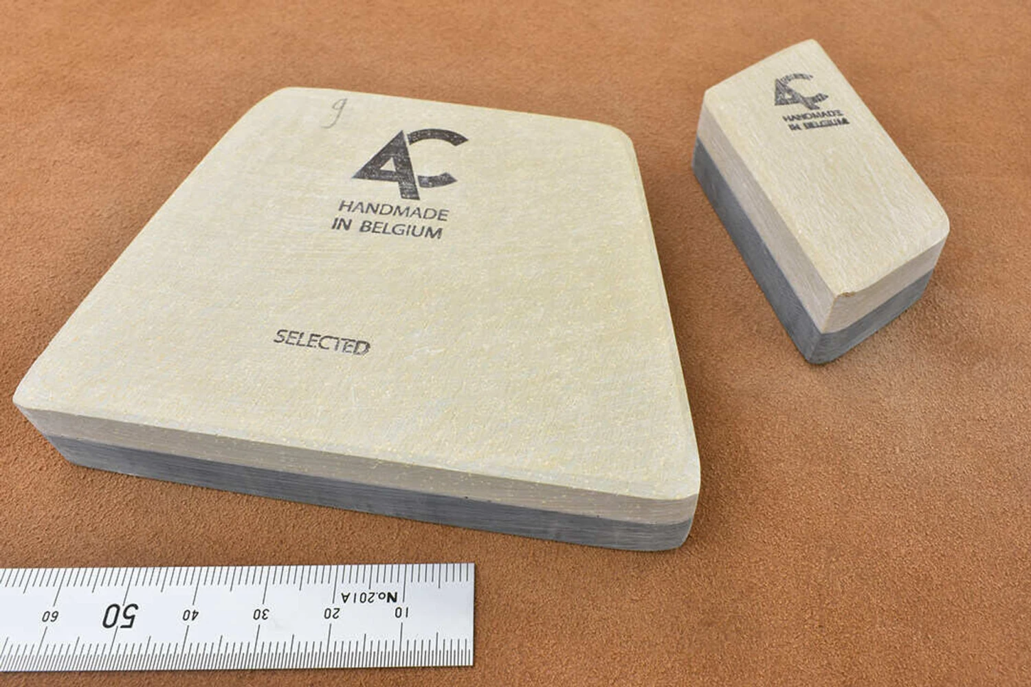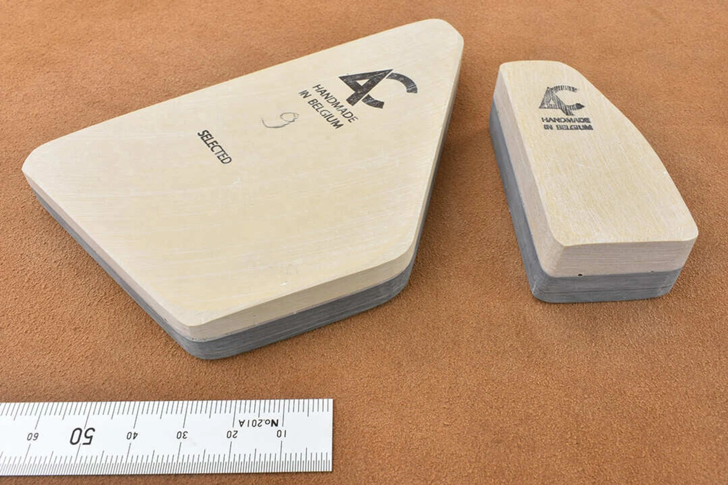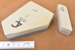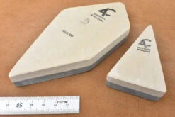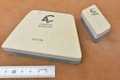 The famous Belgian Coticule, irregular shaped slabs of selected yellow coticule whetstone bonded to a non-sharpening supporting layer of shale. Belgian Coticule bouts come in all different shapes and sizes – triangles, parallelograms, squares, pentagrams. The stones follow the natural shapes available in the rock so each one is absolutely unique, making boxes to fit them can be a fun project.We supply each coticule with its own natural slurry stone, this works like a nagura to open the surface and raise a creamy slurry of sharpening grit.We stock a wide range of sizes and each stone is individually listed so you can see exactly what you are buying, smaller stones are great for sharpening penknives, marking knives and honing the small irons of joinery planes, larger ones are more suitable for chisels, razors and bench plane irons.What grit is coticule? In terms of where it fits into your sharpening regime, the answer is 4000 – 10,000 depending on how you use it.Like wine and people, each piece of natural coticule has it’s own individual characteristics, before very long you won’t worry about grit numbers and will instead be concerned with technique – the interplay of slurry thickness and pressure to get the desired result from your particular stone.At the two extremes, slurry with the consistency of double cream and moderate pressure gives the fastest cut, water only and the lightest possible touch gives the finest polish. Using your slurry stone and a spray bottle to manage the consistency and progressing through double, single, full cream, skimmed milk and water with progressively lighter pressure at each stage is the equivalent of working through the grits. The slurry will eventually blunt with use (how quickly this happens will vary from stone to stone) so rinsing the surface periodically and raising a fresh slurry will keep your coticule cutting efficiently.