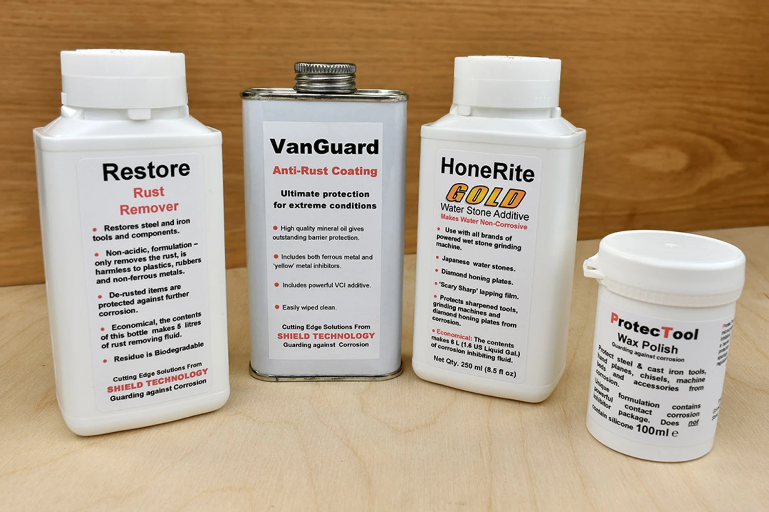 The Shield Technology Corrosion Control Kit contains the four best selling products at one fantastic price! Restore Rust Remover 250ml (makes approx 5 litres) HoneRite Gold Water Additive 250ml (makes 6 litres) Vanguard Anti-Rust Coating 250ml ProtecTool Wax Polish 100ml Regular price if purchased individually: £68.00Restore Rust Remover 250mlA highly concentrated, fully biodegradable, PH neutral liquid rust remover that you mix 19:1 with plain water, so this 250ml bottle will make just under 5 litres of finished strength product that can be re-used several times over.After removing any wooden handles, submerge your rusty item in the solution, and after a couple of hours the rust will have been dissolved. In extreme cases it may be necessary to rinse the part clean and return it to the solution for a second dip.Restore leaves the surface passivated – so there is no problem with post-treatment ‘flash rusting’ associated with acidic formulations and can be poured it down the drain without damaging the environment.HoneRite Gold 125mlA highly concentrated water additive that makes water non-corrosive. Suitable for use with powered wetstone grinders (Tormek etc), diamond stones and all types of waterstones. One 250ml tin is enough to treat 6 litres of water!Vanguard Anti-Rust Coating 250mlOffers a high degree of corrosion protection for metals stored in humid conditions, fluctuating temperatures etc.A high quality mineral oil base provides barrier protection with added ferrous and yellow metal corrosion inhibitors that protect electrochemically and prevent brass components from turning green. A VCI additive turns your treated tool into a VCI emitter in its own right, if stored in an enclosed space the tool will develop its own protective ‘atmosphere’ which will seep into any nooks and crannies.ProtecTool Wax Polish 100mlA silicone-free soft wax polish containing a unique blend of microcrystalline waxes and contact corrosion inhibitors. Provides unbeatable protection against corrosion and rusty finger marks, and significantly reduces the coefficient of friction, making your tools slide beautifully.Apply sparingly to the soles and sides of handplanes, cast iron machine tool beds, chisels, saw blades, etc. Allow to dry for a few minutes before buffing to a shine.