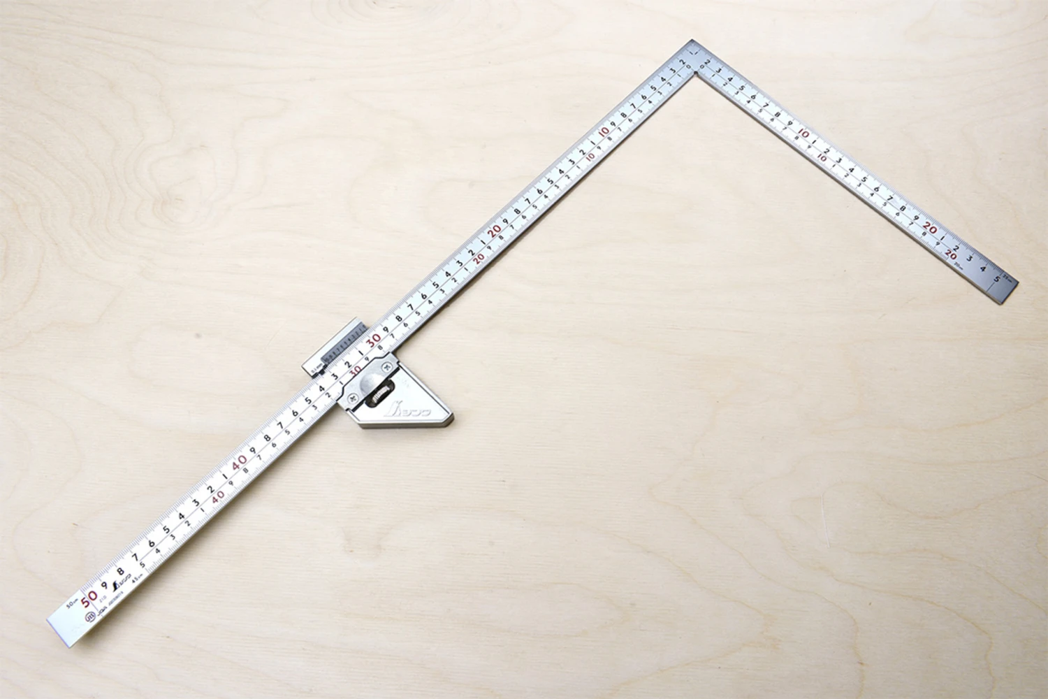 The perfect pairing of a Shinwa 500mm carpenters square and its compatible metal stopper at a discounted price – £57.50 if purchased individually. This square has with deeply etched metric full mm graduations inside and outside on both faces. A hard chrome plated stainless steel, so no rusty fingermarks, it is hardened to Hv320+ for the perfect balance of stability and springiness. Japanese carpenters squares are flat, they are used in the same way as a framing square, with one leg hung over an edge with its face acting as a stock. 500mm long leg, 250mm short leg 2mm x 20mm section Square to better than 0.1mm/100mm Conforms to JIS B7534 Made in Japan This metal stopper greatly improves the versatility of Japanese carpenters squares offering greater durability, includes a vernier scale allowing the conversion, measurement and transfer of ‘gnat’s’, ‘skoaches’ and ‘hair’s breadths’ strong or shy of the measurement, probably overkill for pencil marks, but very nice to have for scalpel work, knife lines, veneering etc. Used in the same way as a combination square head for registering edges at 90 or 45 degrees, but because it’s on a square rather than a rule, you can lay out lines parallel to the reference edge as well as ones perpendicular to it and mark both 45s without having to flip the tool over. The square stopper also acts like the movable jaw of a caliper for gauging the thicknesses of plates or boards and diameters of cylinders. Die cast Captive screw Copper wear plate applies gentle constant pressure on the edge of the square but will not damage it. Dimensions: 83mm length x 42mm width x 12mm deep