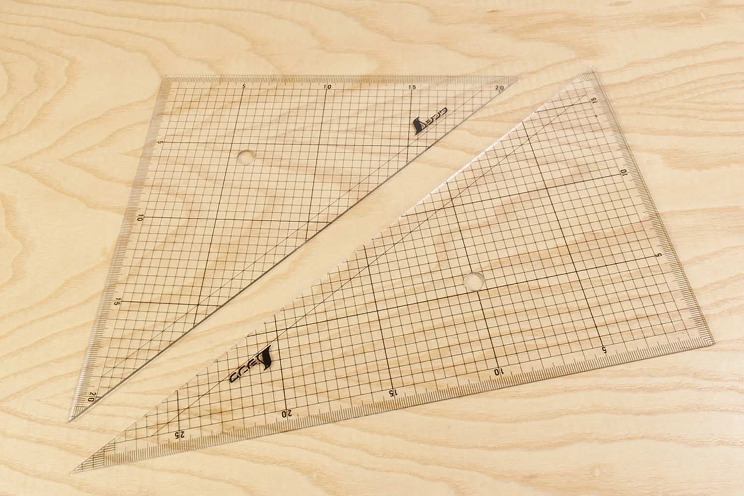 Generously sized, 2mm thick and crystal clear, Shinwa acrylic drawing squares have parallax free mm graduated edges with a 5mm/5cm grid ideal for enlarging sketches, marking parallel lines etc.At the points there are a little stack of perpendicular mm, so you can offset by a given amount and remain parallel – subtle, but it’s the kind of really nice little touch you get from a company that cares about what they are making.45 / 45 / 90 (21.3 x 21.3 x 300mm)30 / 60 / 90 (300mm x 175mm x 34.75mm))
