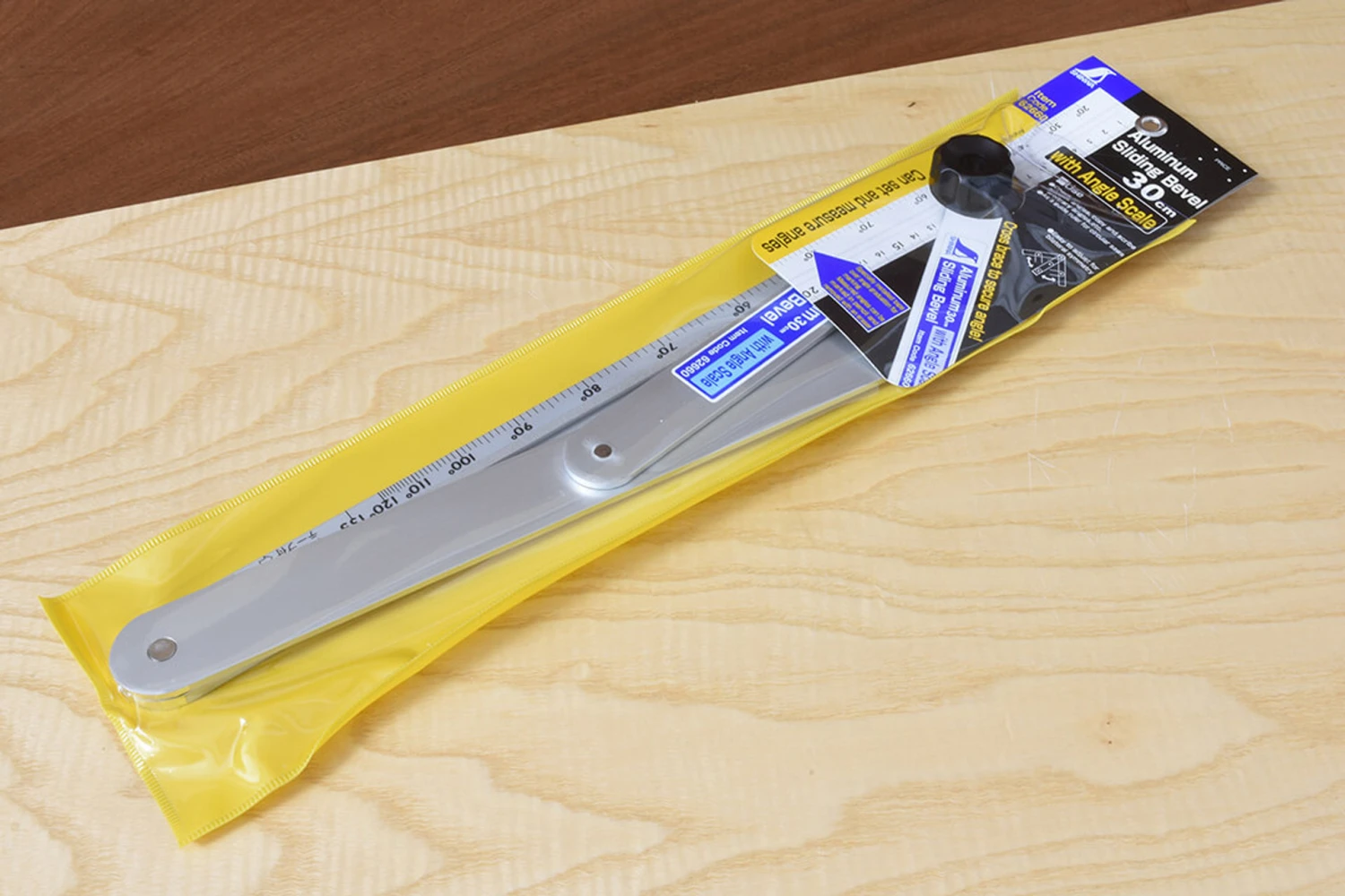 The cleverly designed Shinwa aluminium sliding bevel can be rotated through a full 360 degrees and locked at any position.An angle scale is provided allowing angles to be set or measured within a 20 -135° range. The scale is covered with a special tape that be written on with a pencil and rubbed clean with a finger, so you can note angles taken by direct measurement. On the other edge is a 300mm scale in full mm allowing the bevel to double as a rule and depth gauge.Simple and surprisingly accurate, the braced design with large locking screw feels safe, solid and rigid when set.