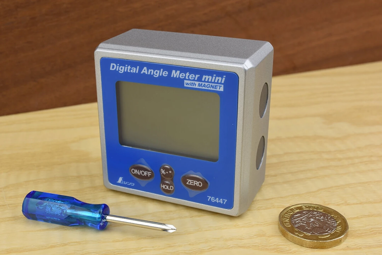 The Shinwa digital angle meter is used for measuring angles relative to horizontal, (or vertical) and relative to each other in degrees or % (handy if you prefer straightforward ratios to trigonometry). I have seen similar devices variously described as a level box, angle finder, digital angle gauge and even inclinometer (which it isn’t because an inclinometer also has some form of sight attached) either way, I’m sticking with digital angle meter. As with most digital devices, there are cheap and cheerful mechanisms and good ones, (the layout of the buttons gives you a clue) so the sweet spot is a good one at a reasonable price. Housed in a beautifully cast aluminium body with twin magnets on both sides and the base, the Shinwa measures angles in degrees or % incline to 1 decimal place. If used upside down (i.e. stuck to the ceiling) the readout inverts so you can still see the measurement. When first switched on the word LEVEL will appear on the display showing that you are measuring relative to horizontal. Pressing the zero button sets the current angle as zero and the device will then measure variance from that angle (turn off and on again to return to measuring from horizontal). Pressing hold locks the display at the current reading. Pressing the percent degree button switches between readout modes. Supplied complete with screwdriver for removing the back plate to change the battery (one of those 9v rectangular ones with both terminals on one end).