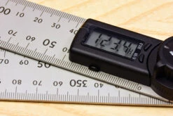 The Shinwa digital protractor or digital angle finder uses a stainless steel folding rule design with 280mm legs.To zero the device align the legs and press the zero/on switch, if measuring for a chopsaw you may wish to start from 90. Press the legs into position against the surfaces to be measured, the angle is displayed on the readout and can be stored by pressing the hold button. The pivot between the two legs can be tightened or loosened by twisting the black ABS knob.The digital scale will measure upwards from 0° to 360° regardless whether the blades are moved clockwise or anticlockwise, so if you need external or reverse angles just go the long way round.One scale is laid out as a continuous 600mm rule starting from the left hand end, the other begins in both directions from the centre of the internal angle when the legs are set to 90 (like a Japanese carpenter’s square).Display resolution 0.1 degreeDisplay accuracy 0.3 degree