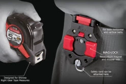 The Shinwa MAG-LOCK has been designed as a belt holder for Right Gear 25mm width tape measures giving secure, easy access.You need to remove the existing belt clip on the back of the tape and replace with the magnetic clasp. The neodymium magnet attracts the tape in place, which is then held with the side clasps. To release its a simple press of the button.The holder can be attached without removing your belt and can be firmly fixed with screw. There’s also a spacer which ensure correct fitting regardless of the thickness of the belt.It can be attached either vertically or horizontally and has a loop at the base which can be used to secure a safety cord.Dimensions; 95 x 60 x 33mm