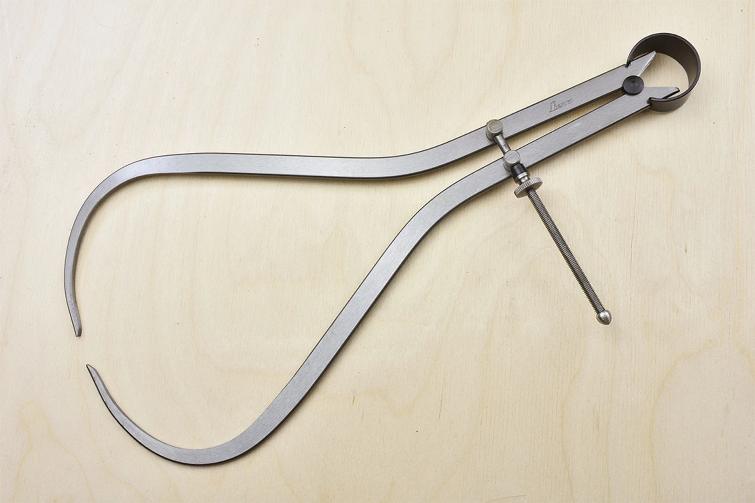The Shinwa spring joint outside calipers are manufactured from high quality carbon steel with ground finished points. A circular spring bow joins the legs for a uniform tension over the working range. The distance between the two points is controlled using the fine adjusting screw mounted across the legs, offering a finer setting than firm joint type calipers. 300mm radius Made in Japan