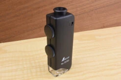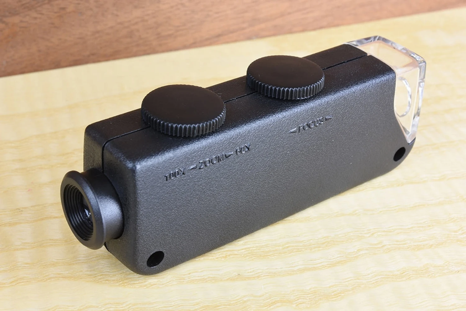 Sometimes it’s really useful to get a really close look at a surface; comparing the scratch patterns left by different sharpening stones, or perhaps encouraging youngsters to explore a fascination with nature? This simple but effective pocket sized microscope from Japanese metrology specialists Shinwa (the people who make those really nice squares and rules) is adjustable to give 60x to 100x magnification, as handy as a Jewellers loupe but more powerful. The top knob adjusts the zoom, the bottom one adjusts the focus. It has a built in LED light source, and a large enough viewing aperture that with a bit of careful balancing you can just get a photo with a phone camera. The round image was taken in this way – a closeup of the Shinwa penguin’s eye on a 700A taper gauge. Sturdy ABS body Supplied with protective neoprene slip case. Polycarbonate light box allows external light sources to be used as well. Uses LR1130 batteries.