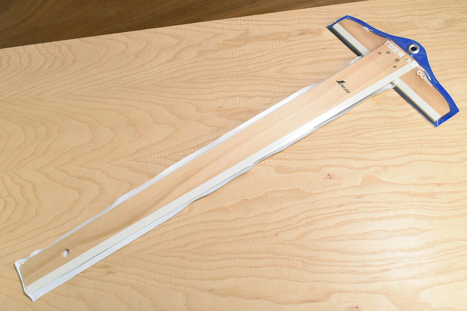 A wooden T-Square, used with a drawing board to give consistent parallel horizontal or vertical lines with reference to the edges of the board.The edges are inlaid with plastic facings for a smooth, accurate line..